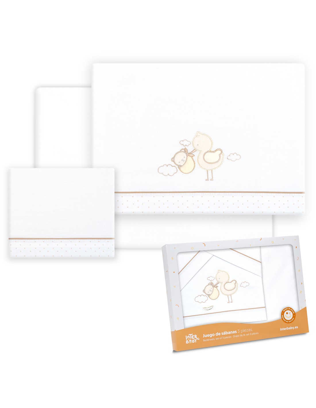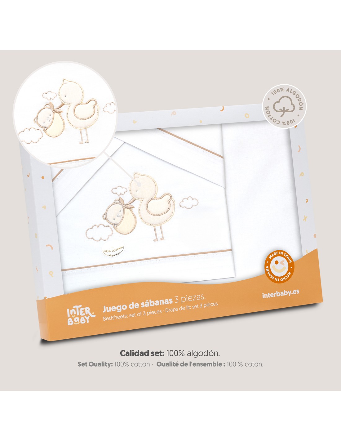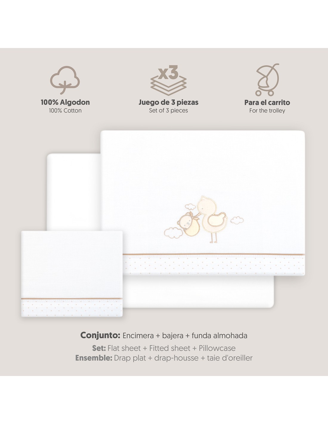 Compuesto por encimera (72 X 114cm) , bajera (40 X 80 cm) y funda de almohada (40 x 25 cm). 100 % algodón. Lavar en frío.
