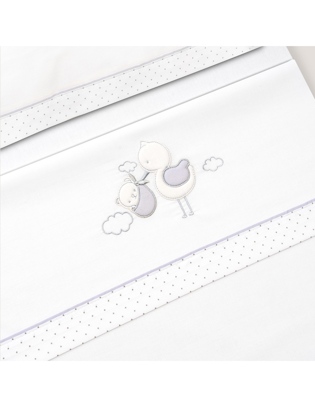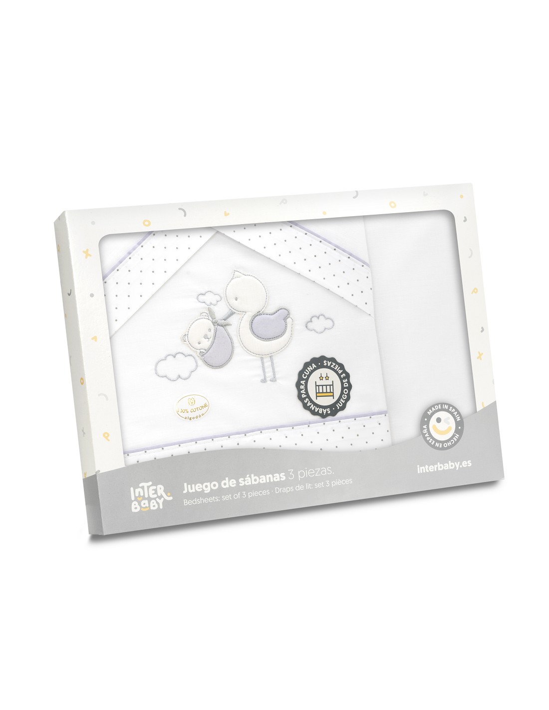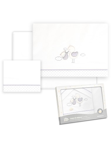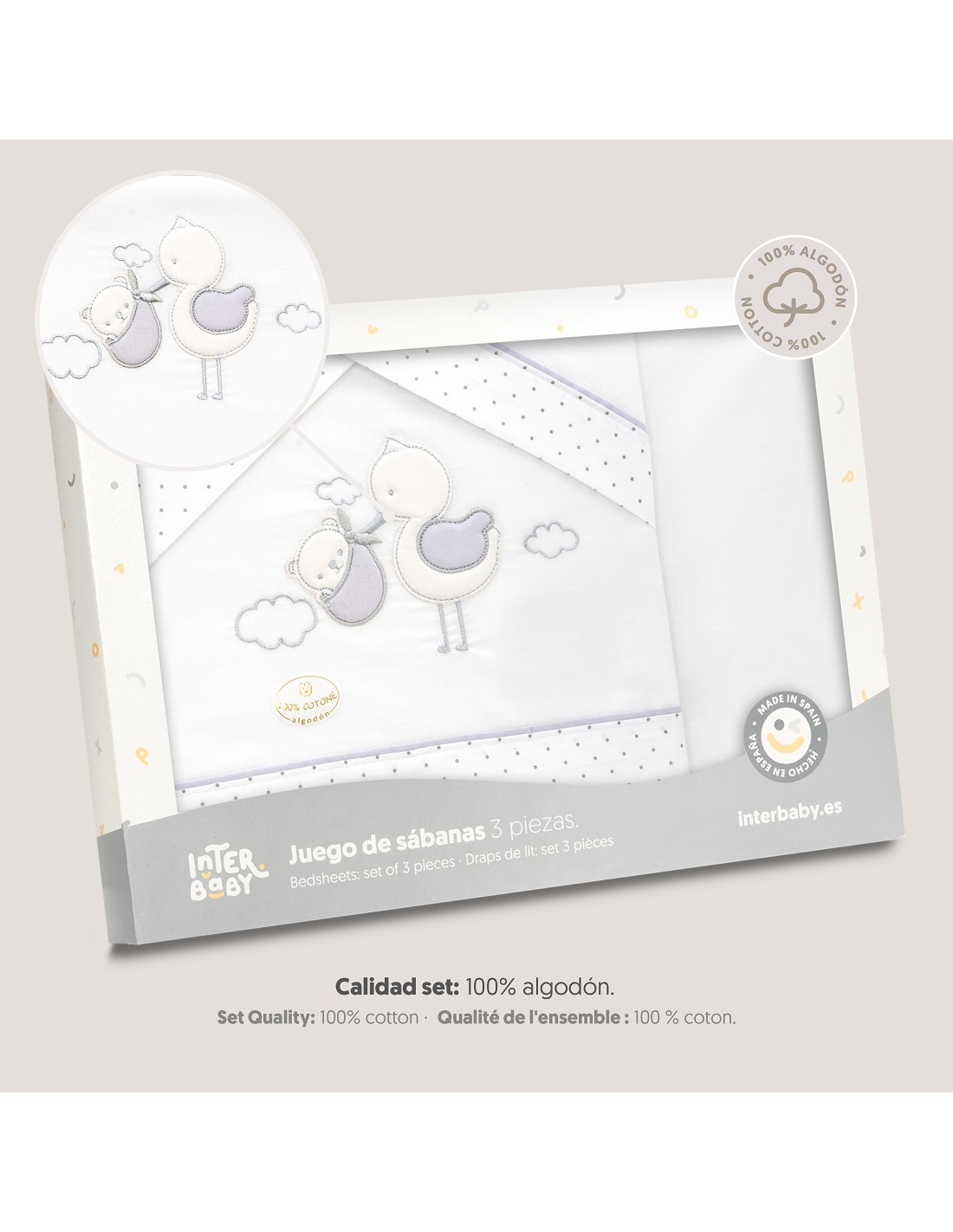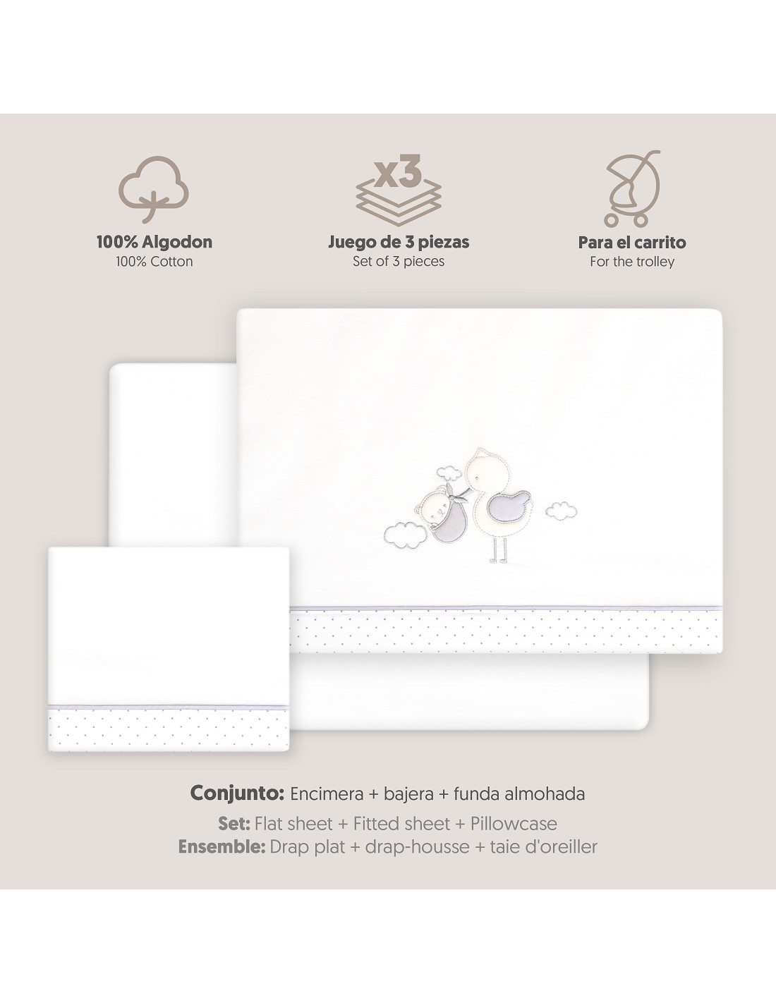 Compuesto por encimera (72 X 114cm) , bajera (40 X 80 cm) y funda de almohada (40 x 25 cm). 100 % algodón. Lavar en frío.