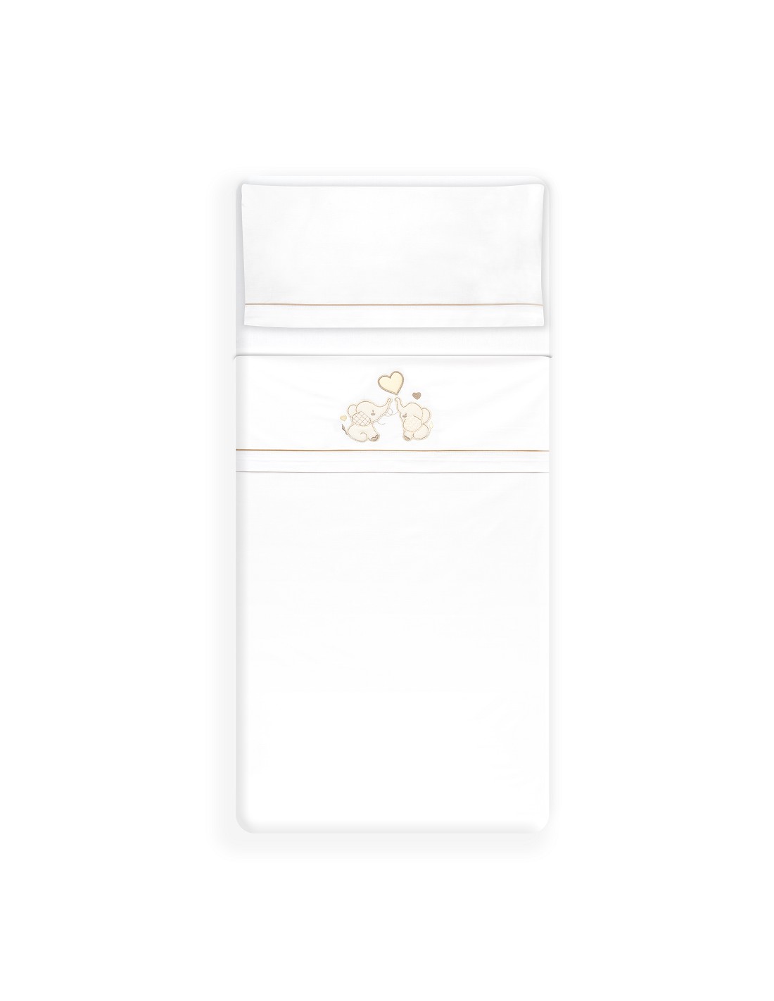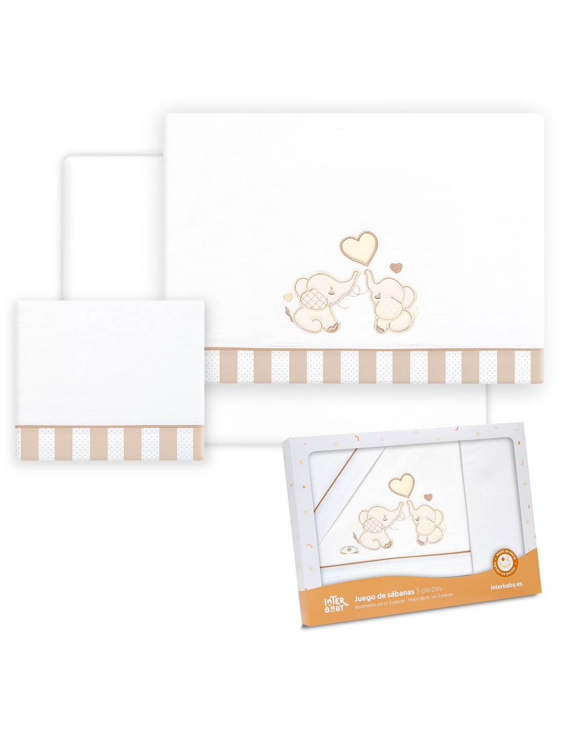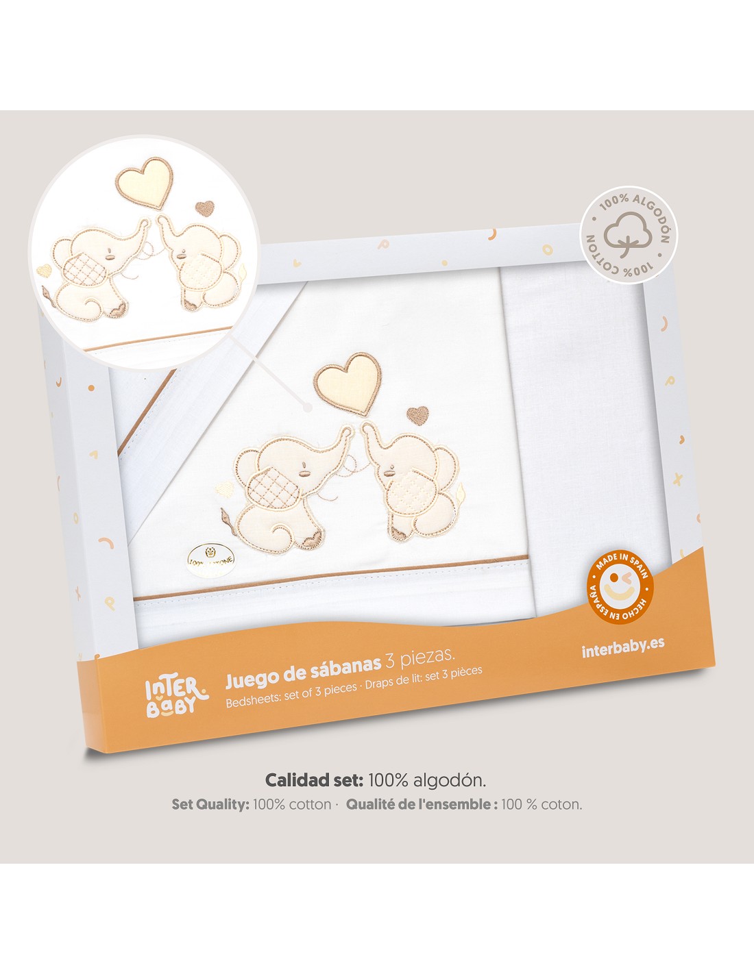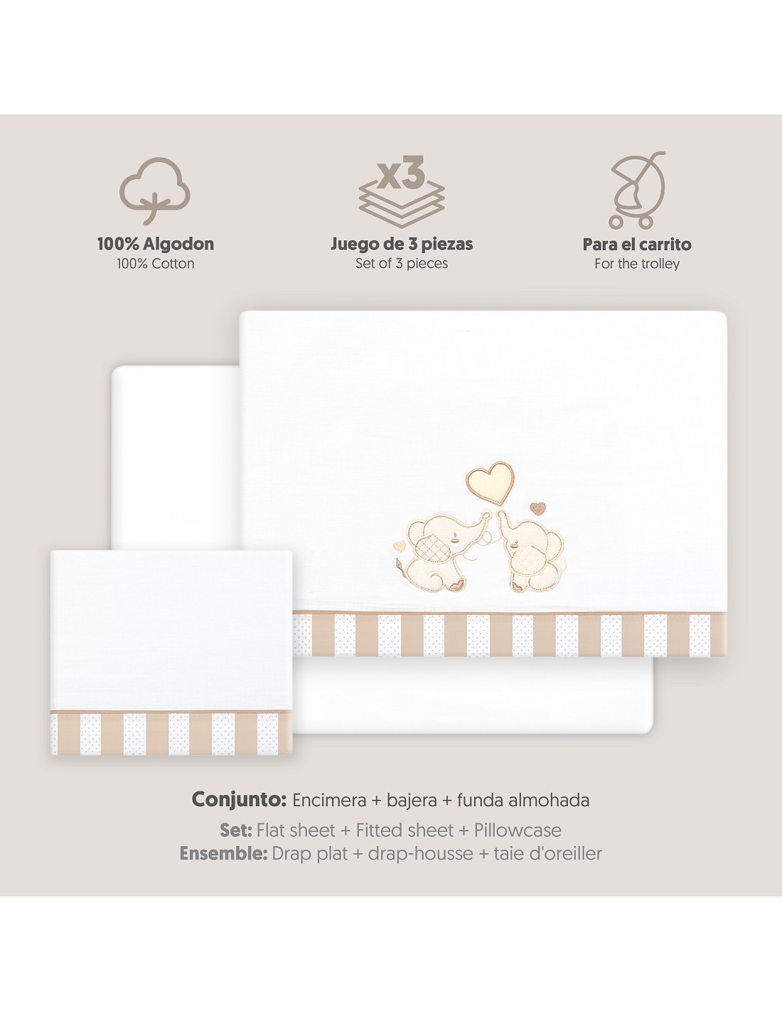 Compuesto por encimera (72 X 114cm) , bajera (40 X 80 cm) y funda de almohada (40 x 25 cm). 100 % algodón. Lavar en frío.