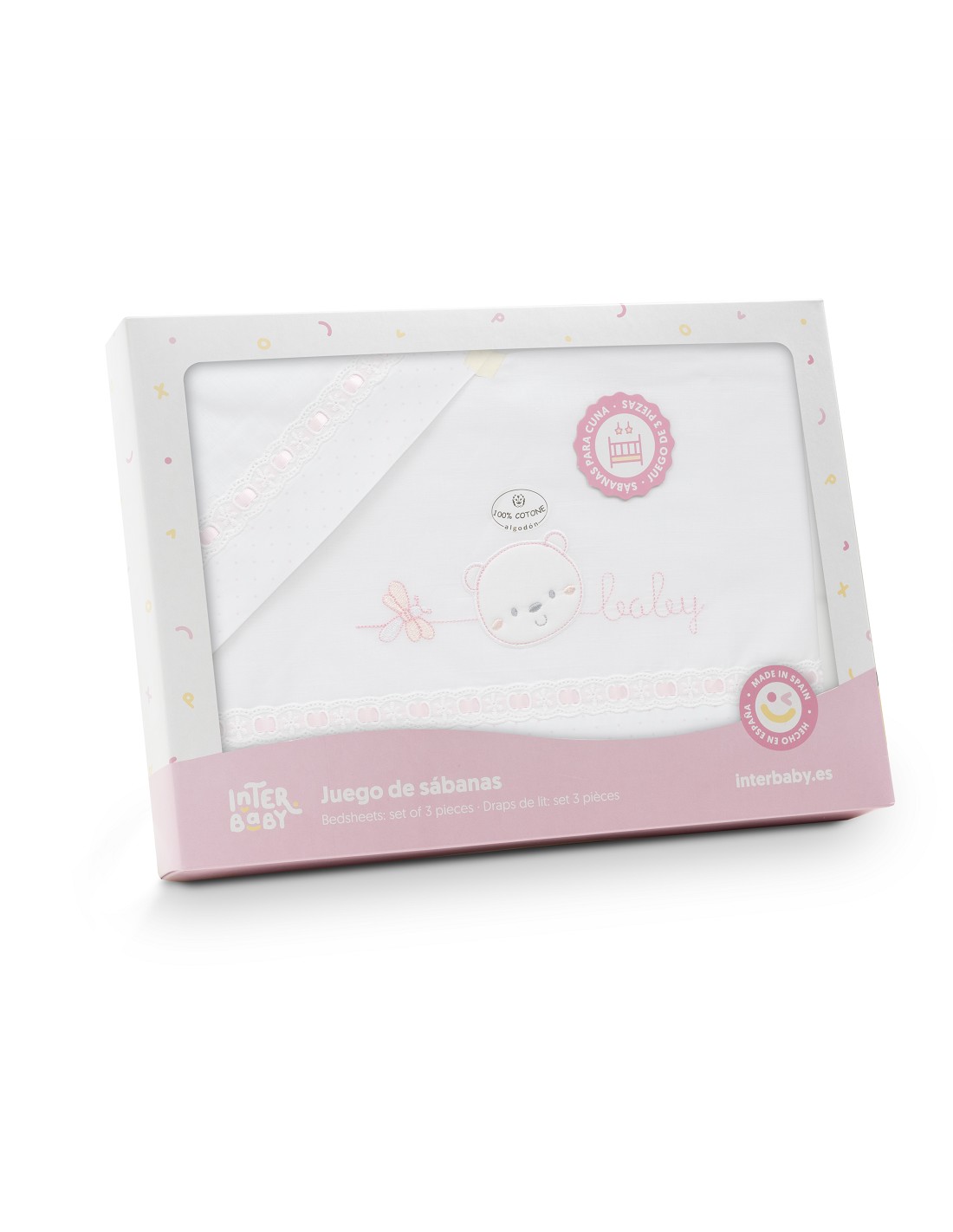 Compuesto por encimera (82 x 114 cm) , bajera (50 x 80 cm) y funda de almohada (50 x 30 cm). 100 % algodón. Lavar en frío.
