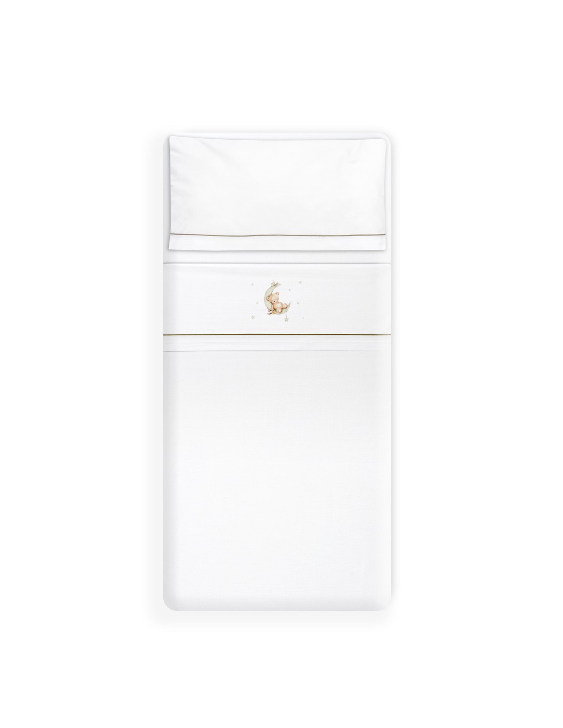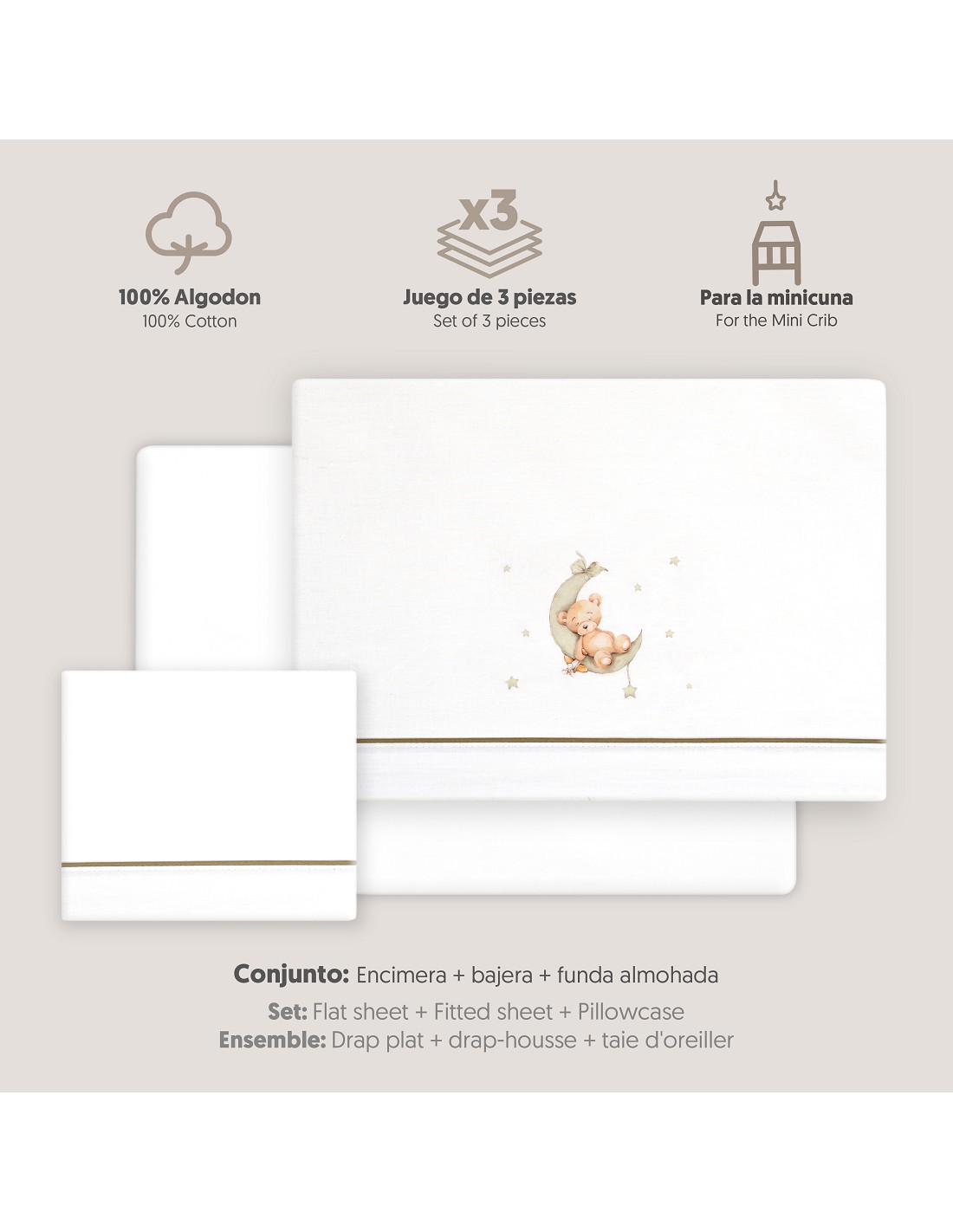 Compuesto por encimera (82 x 114 cm) , bajera (50 x 80 cm) y funda de almohada (50 x 30 cm). 100 % algodón. Lavar en frío.