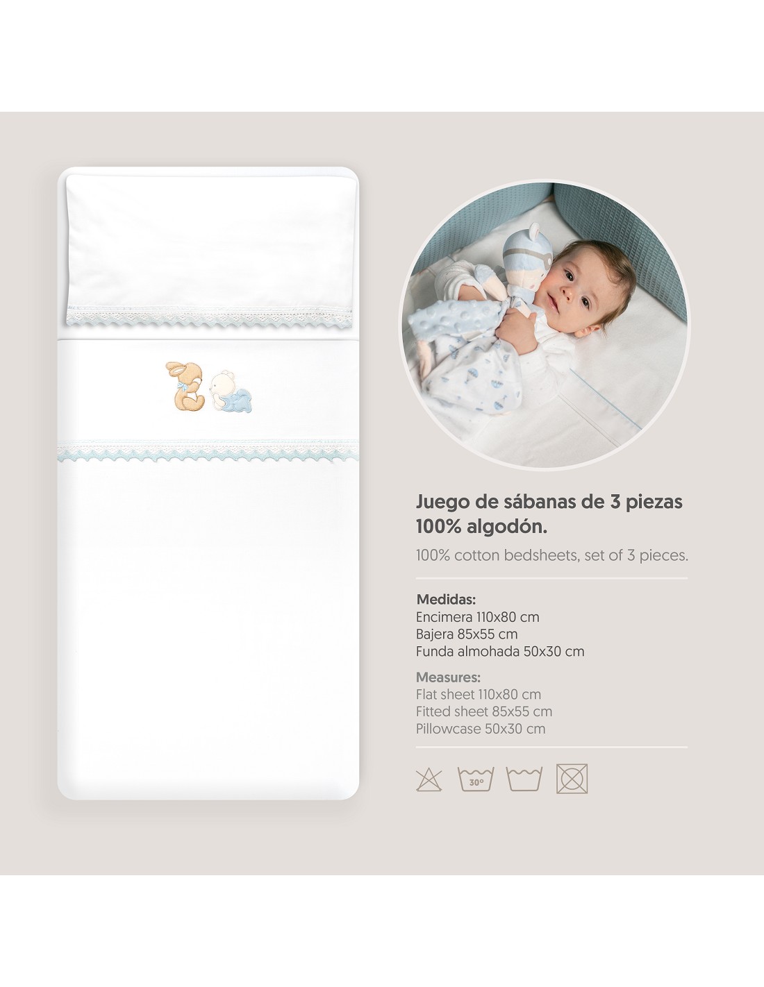 Compuesto por encimera (82 x 114 cm) , bajera (50 x 80 cm) y funda de almohada (50 x 30 cm). 100 % algodón. Lavar en frío.