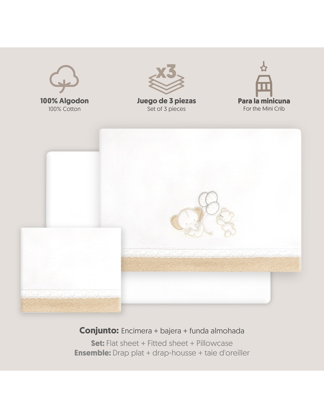 Compuesto por encimera (82 x 114 cm) , bajera (50 x 80 cm) y funda de almohada (50 x 30 cm). 100 % algodón. Lavar en frío.