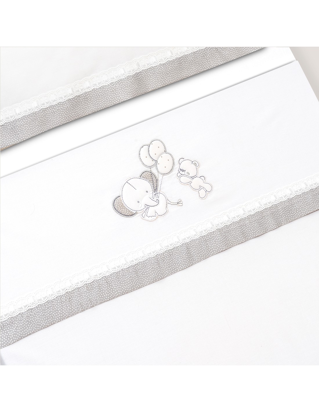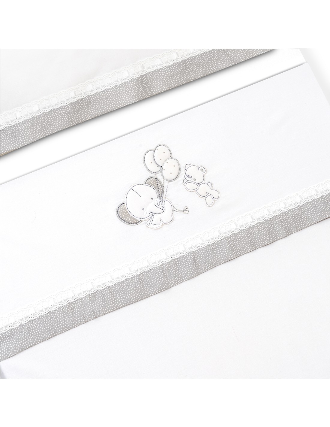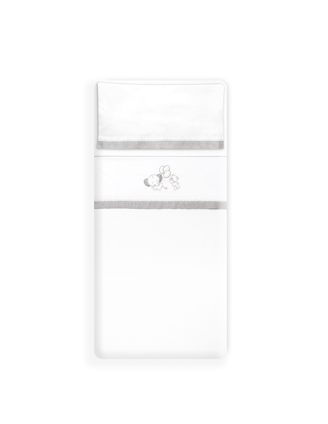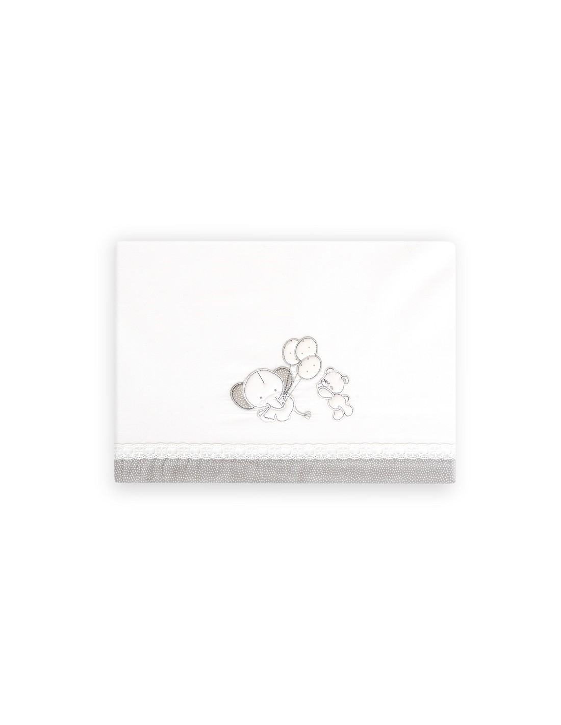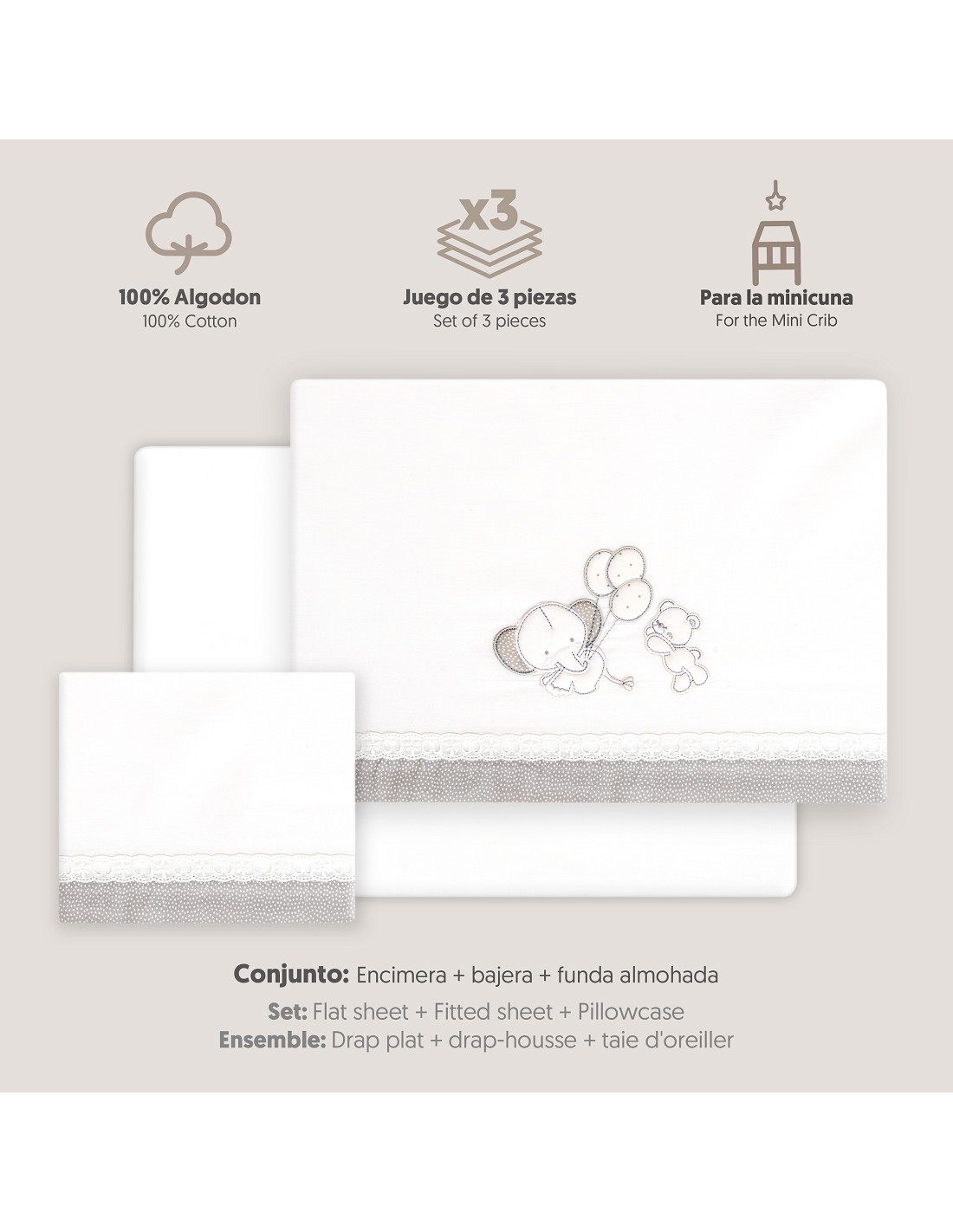 Compuesto por encimera (82 x 114 cm) , bajera (50 x 80 cm) y funda de almohada (50 x 30 cm). 100 % algodón. Lavar en frío.