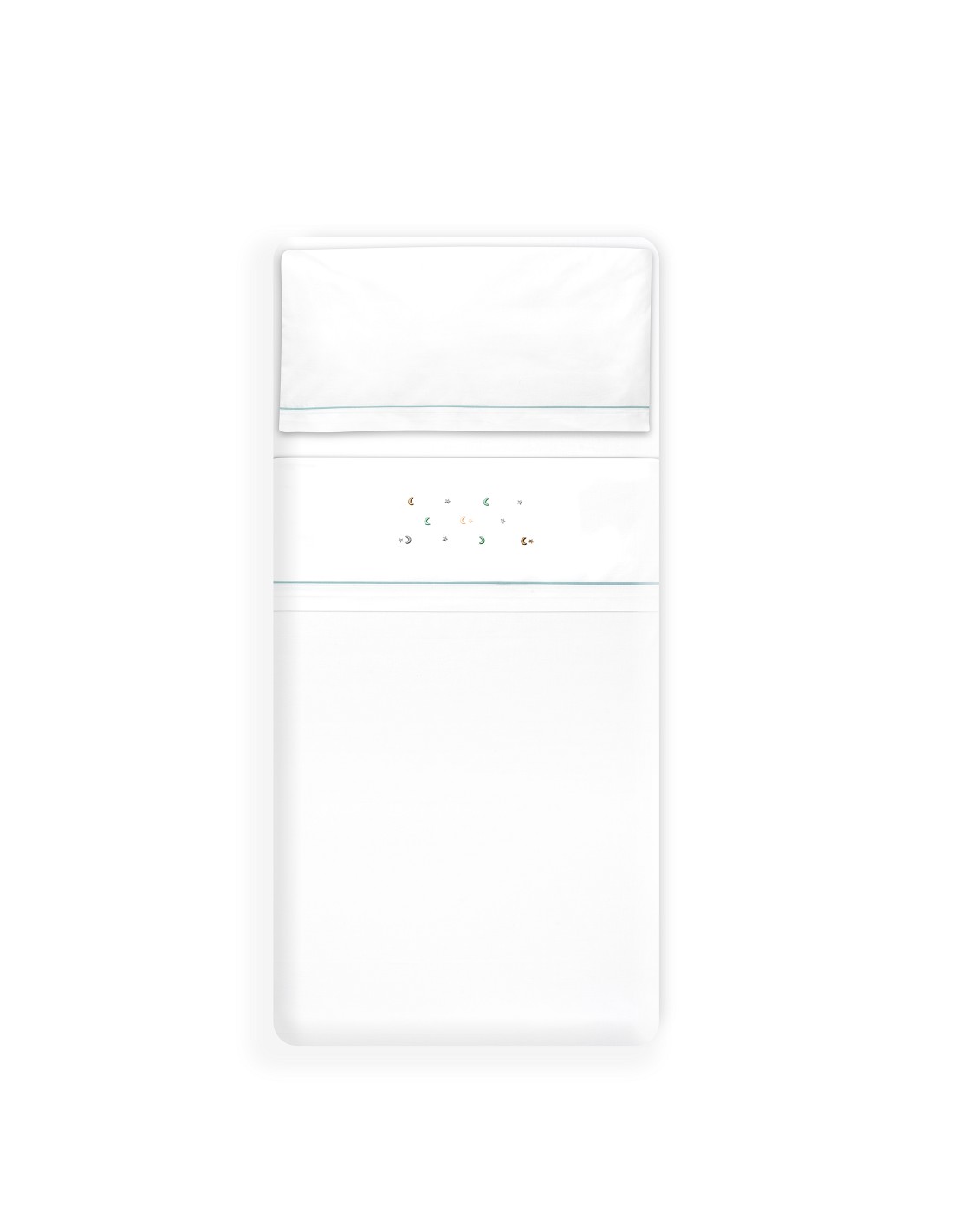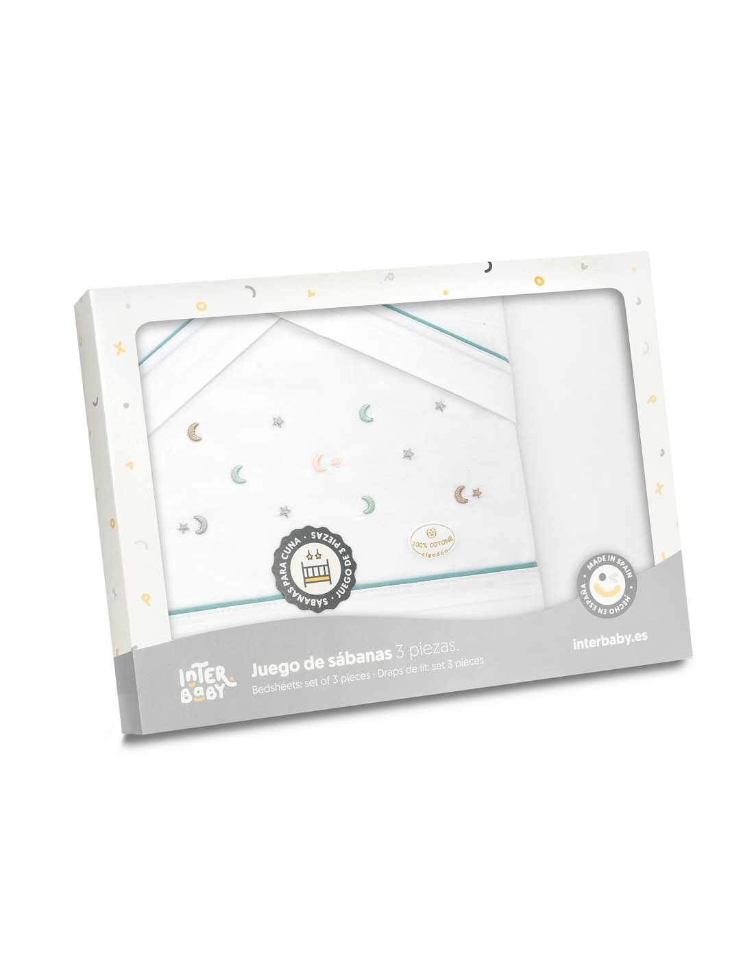Compuesto por encimera (82 x 114 cm) , bajera (50 x 80 cm) y funda de almohada (50 x 30 cm). 100 % algodón. Lavar en frío.