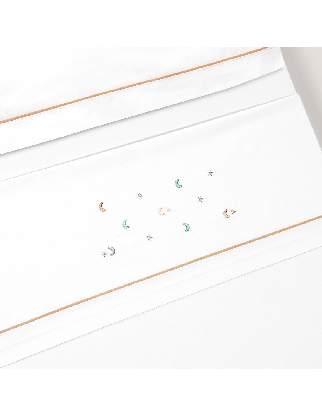 Compuesto por encimera (82 x 114 cm) , bajera (50 x 80 cm) y funda de almohada (50 x 30 cm). 100 % algodón. Lavar en frío.