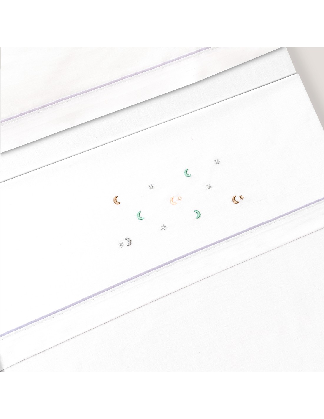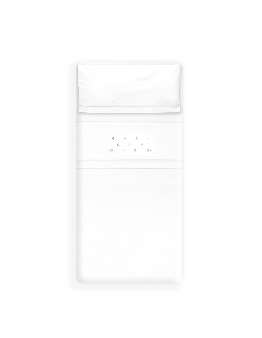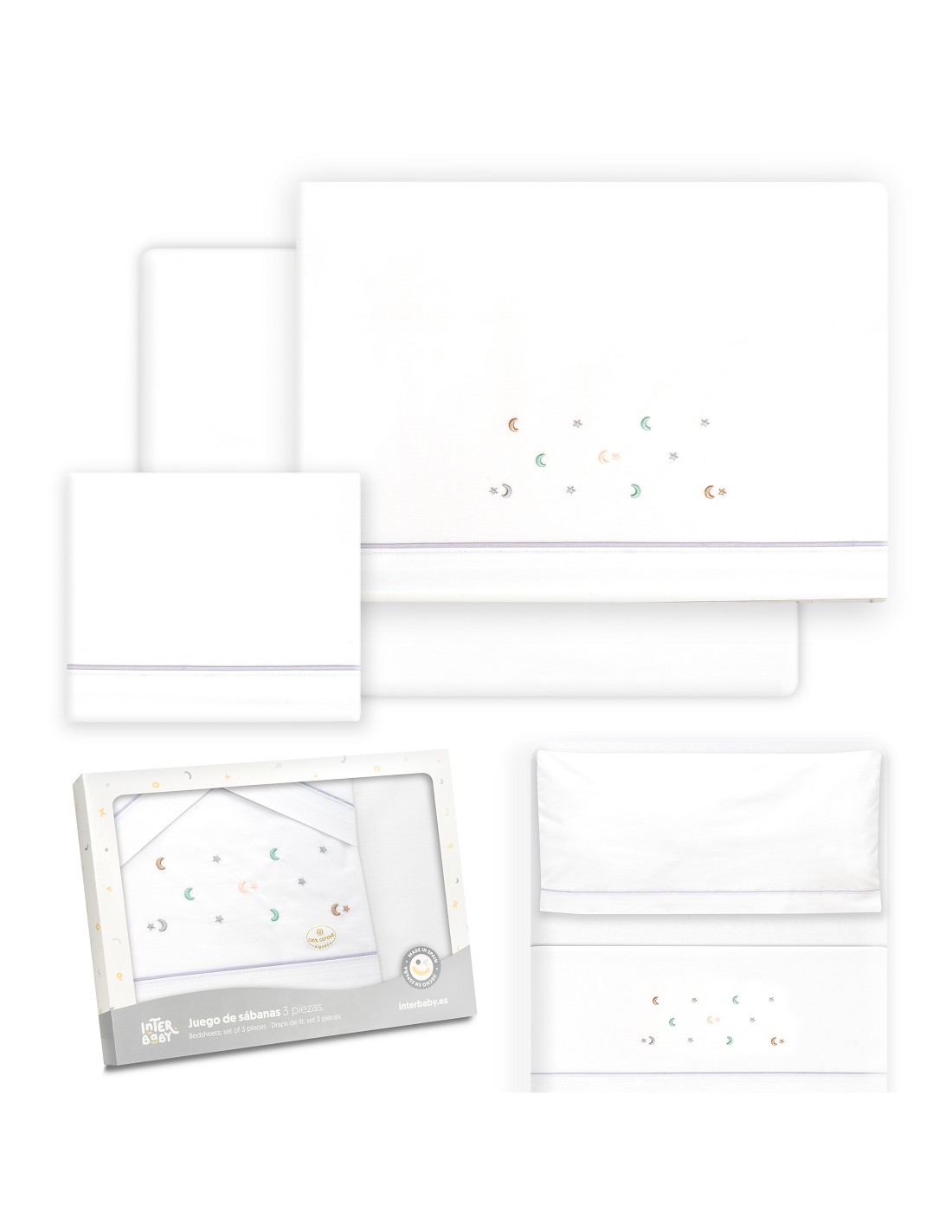 Compuesto por encimera (82 x 114 cm) , bajera (50 x 80 cm) y funda de almohada (50 x 30 cm). 100 % algodón. Lavar en frío.