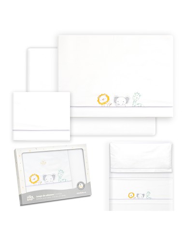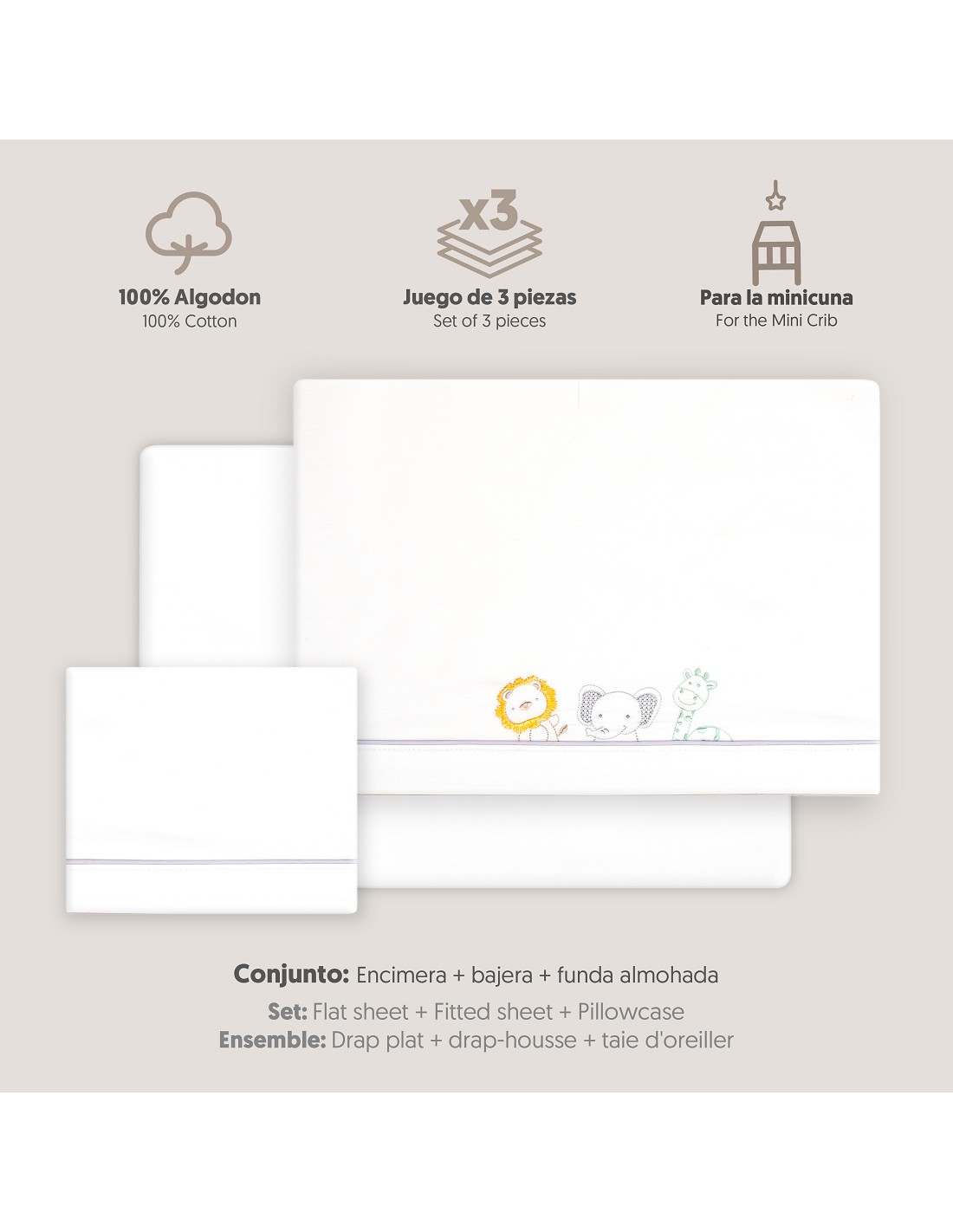 Compuesto por encimera (82 x 114 cm) , bajera (50 x 80 cm) y funda de almohada (50 x 30 cm). 100 % algodón. Lavar en frío.