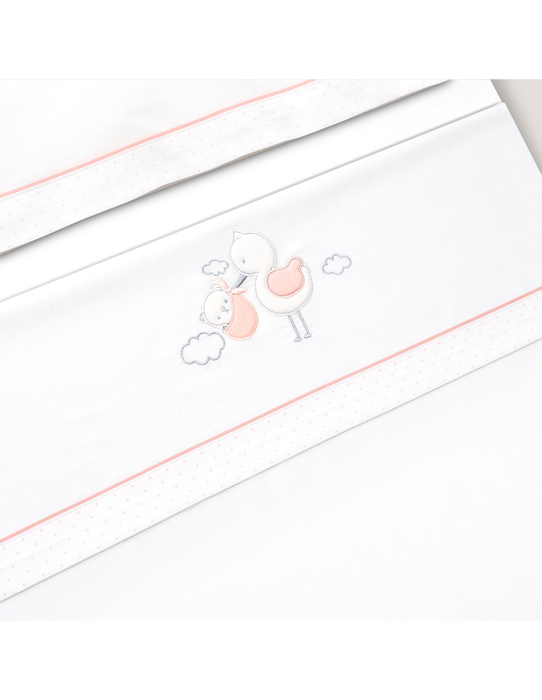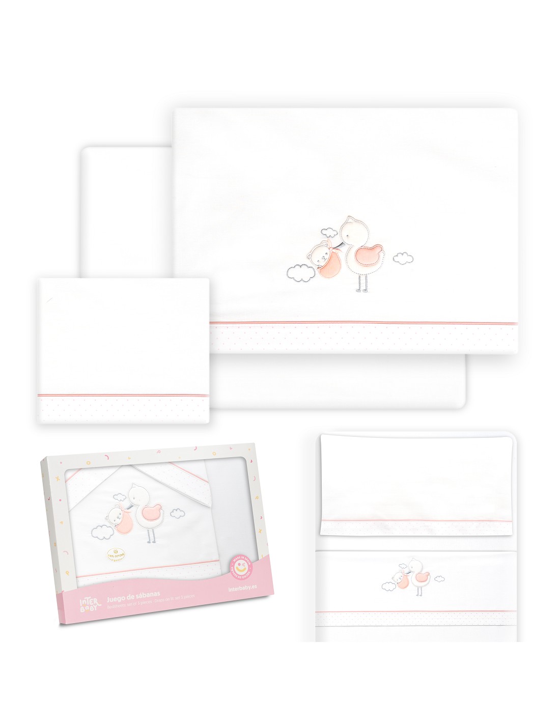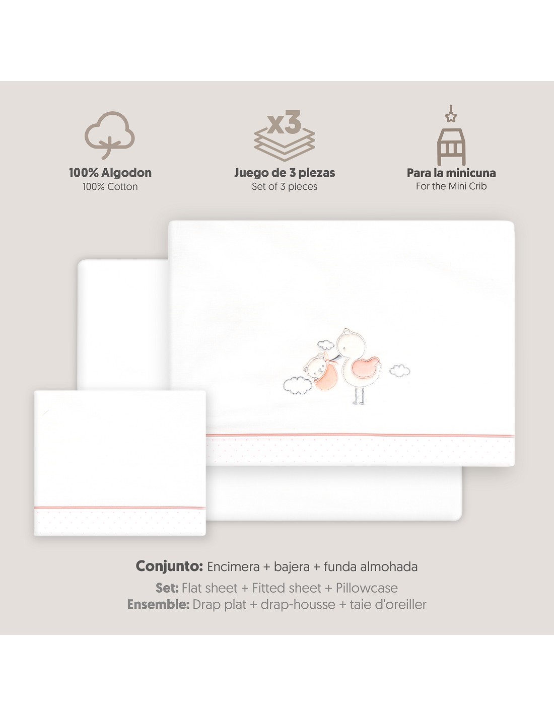 Compuesto por encimera (82 x 114 cm) , bajera (50 x 80 cm) y funda de almohada (50 x 30 cm). 100 % algodón. Lavar en frío.