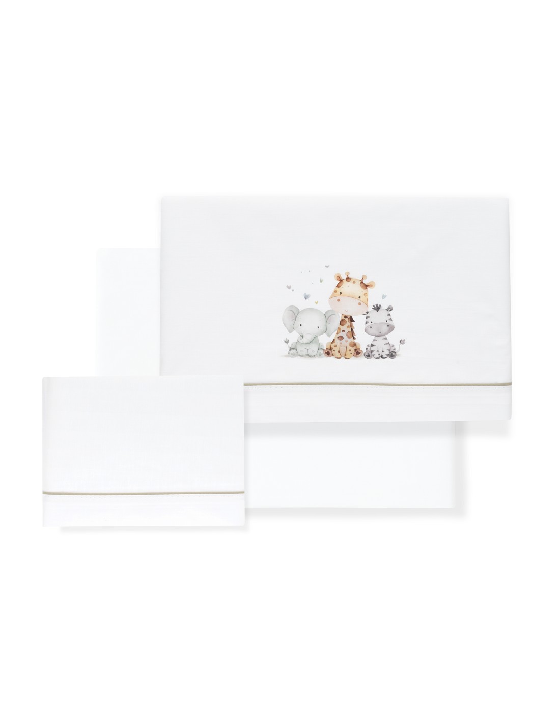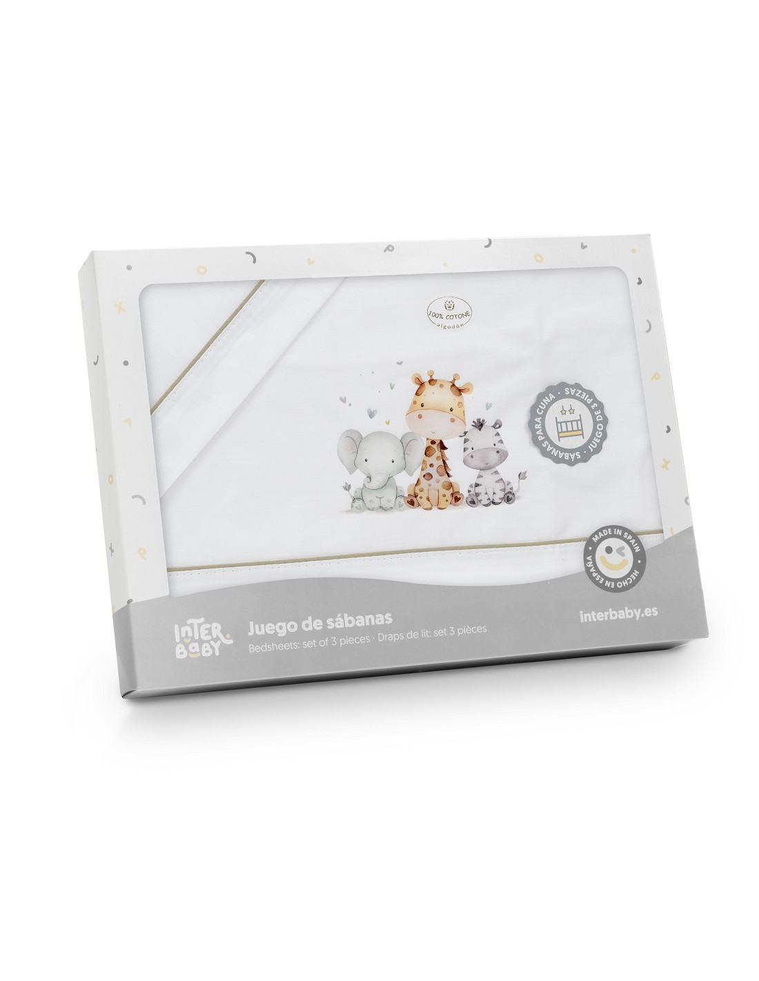 Compuesto por encimera (72 X 114cm) , bajera (40 X 80 cm) y funda de almohada (40 x 25 cm). 100 % algodón. Lavar en frío.