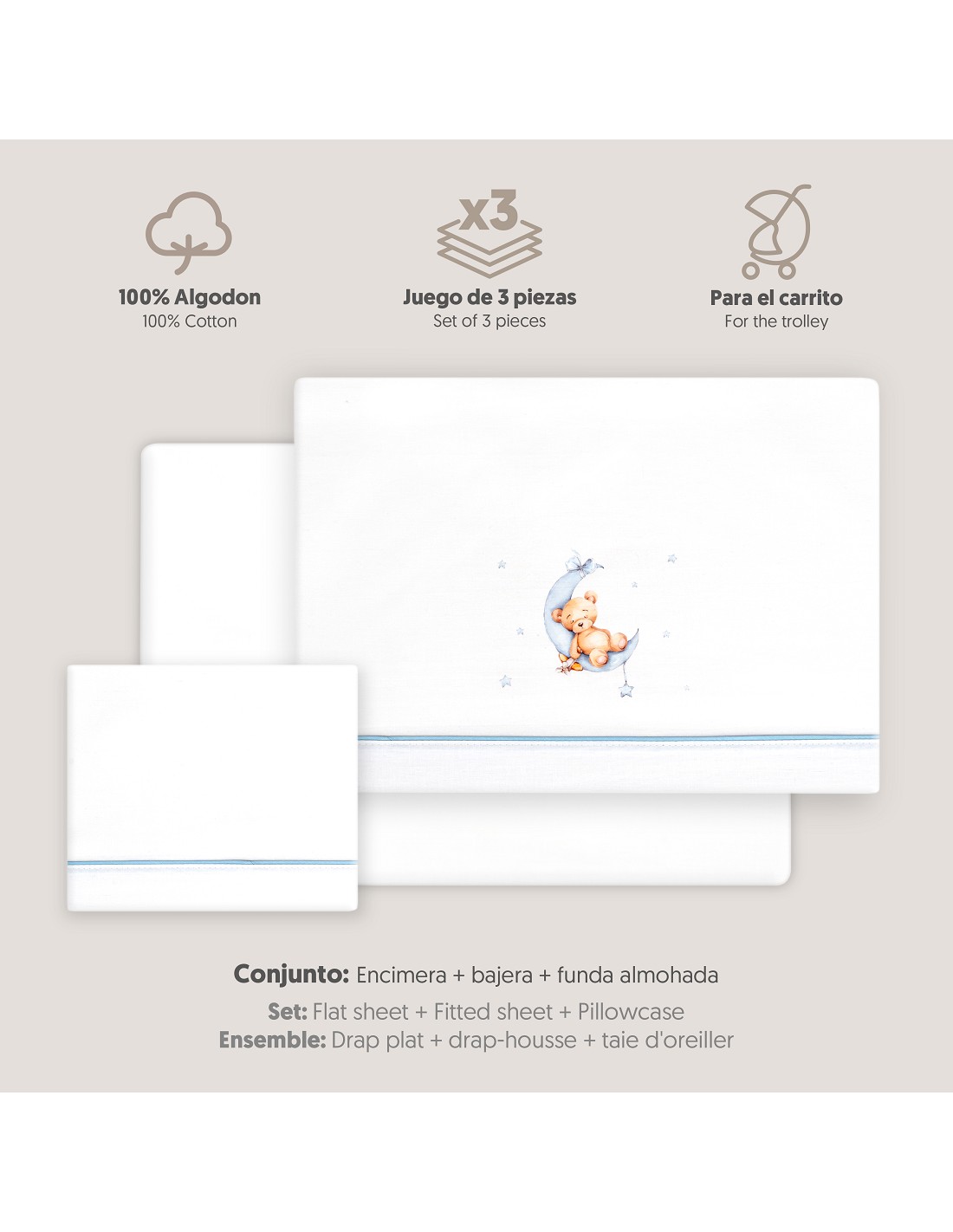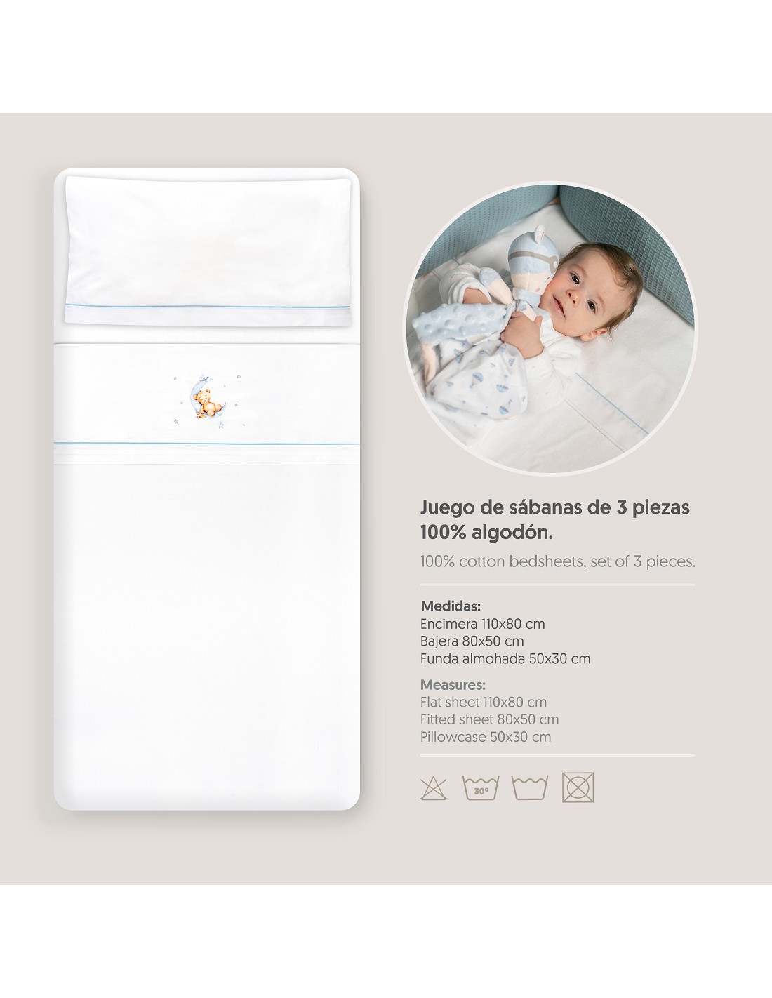 Compuesto por encimera (72 X 114cm) , bajera (40 X 80 cm) y funda de almohada (40 x 25 cm). 100 % algodón. Lavar en frío.