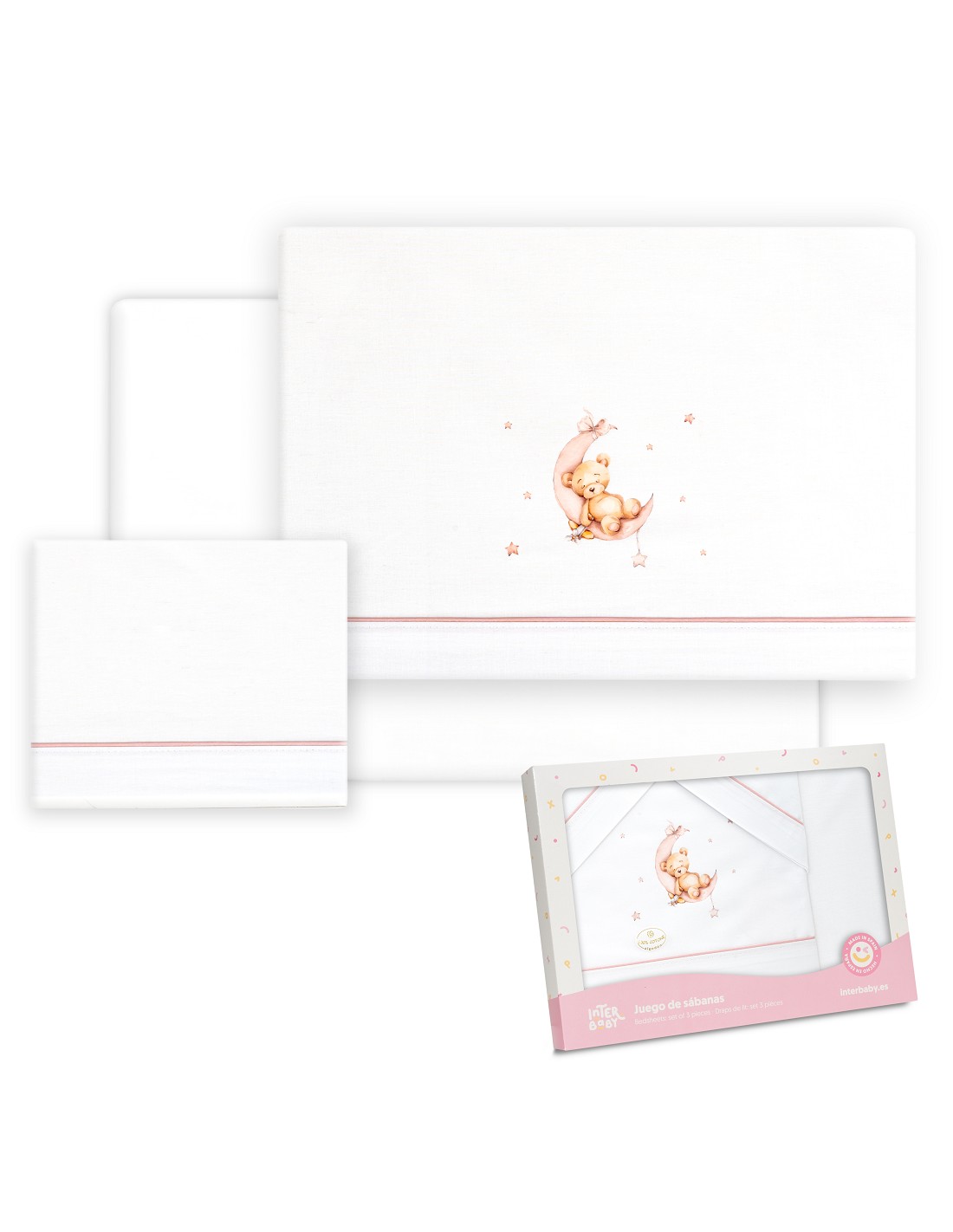 Compuesto por encimera (72 X 114cm) , bajera (40 X 80 cm) y funda de almohada (40 x 25 cm). 100 % algodón. Lavar en frío.