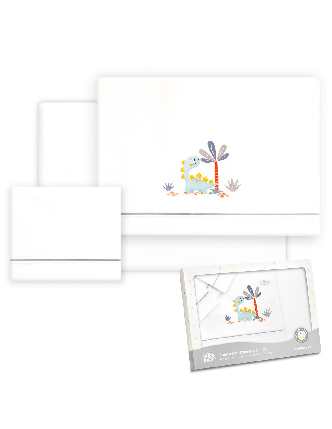 Compuesto por encimera (72 X 114cm) , bajera (40 X 80 cm) y funda de almohada (40 x 25 cm). 100 % algodón. Lavar en frío.