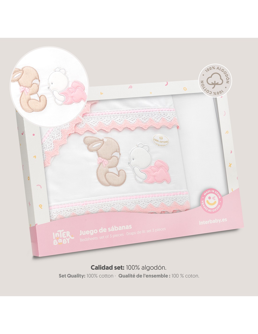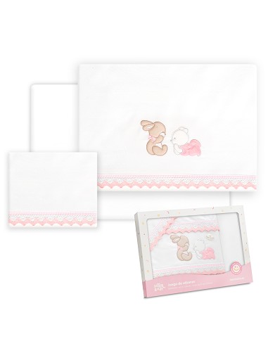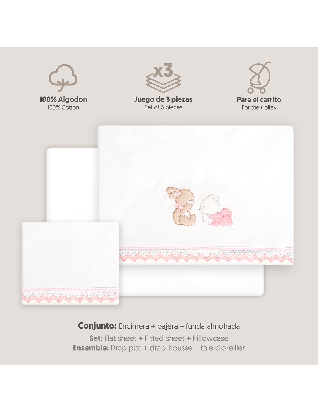 Compuesto por encimera (72 X 114cm) , bajera (40 X 80 cm) y funda de almohada (40 x 25 cm). 100 % algodón. Lavar en frío.