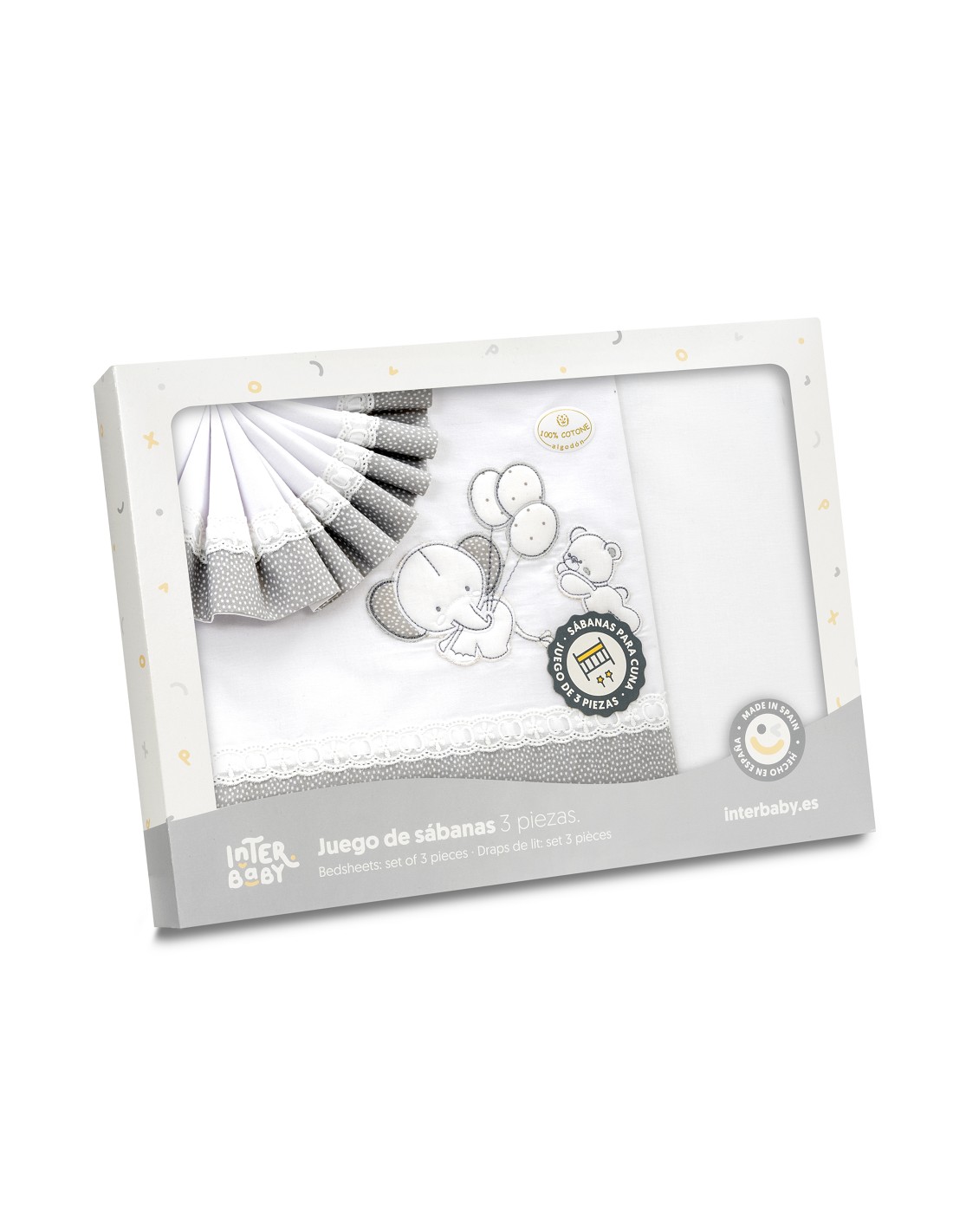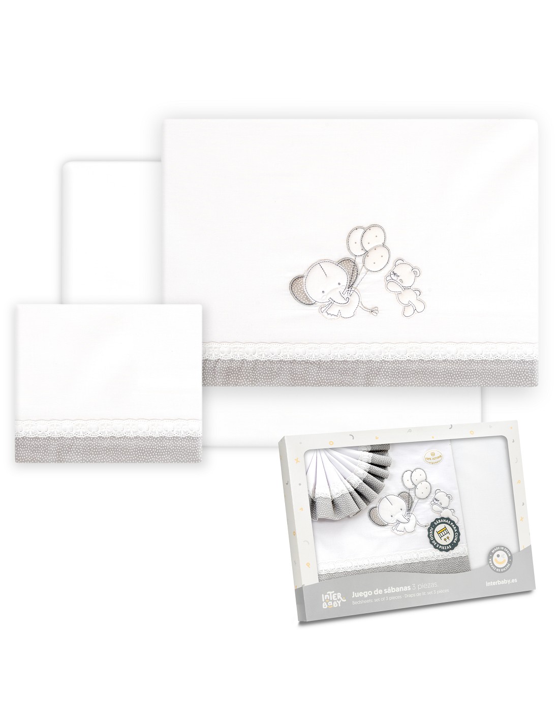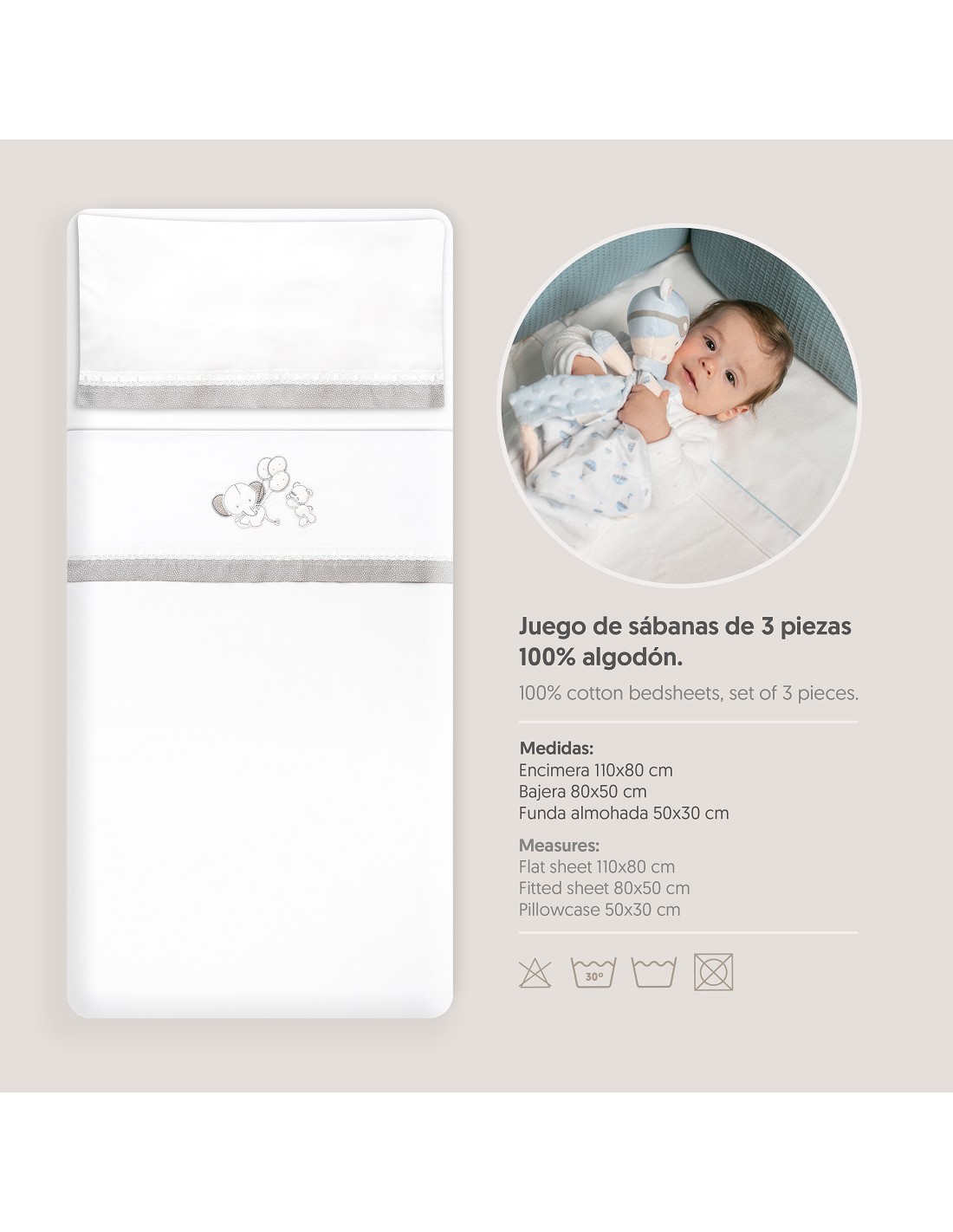 Compuesto por encimera (72 X 114cm) , bajera (40 X 80 cm) y funda de almohada (40 x 25 cm). 100 % algodón. Lavar en frío.