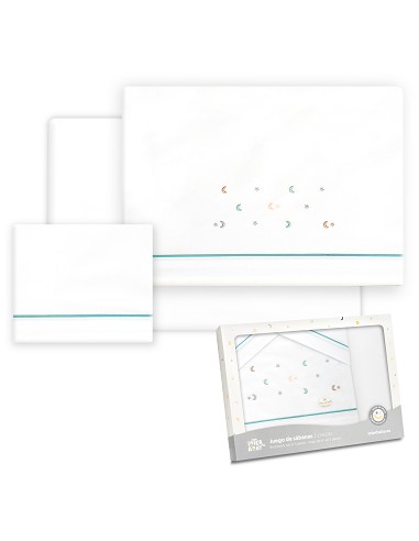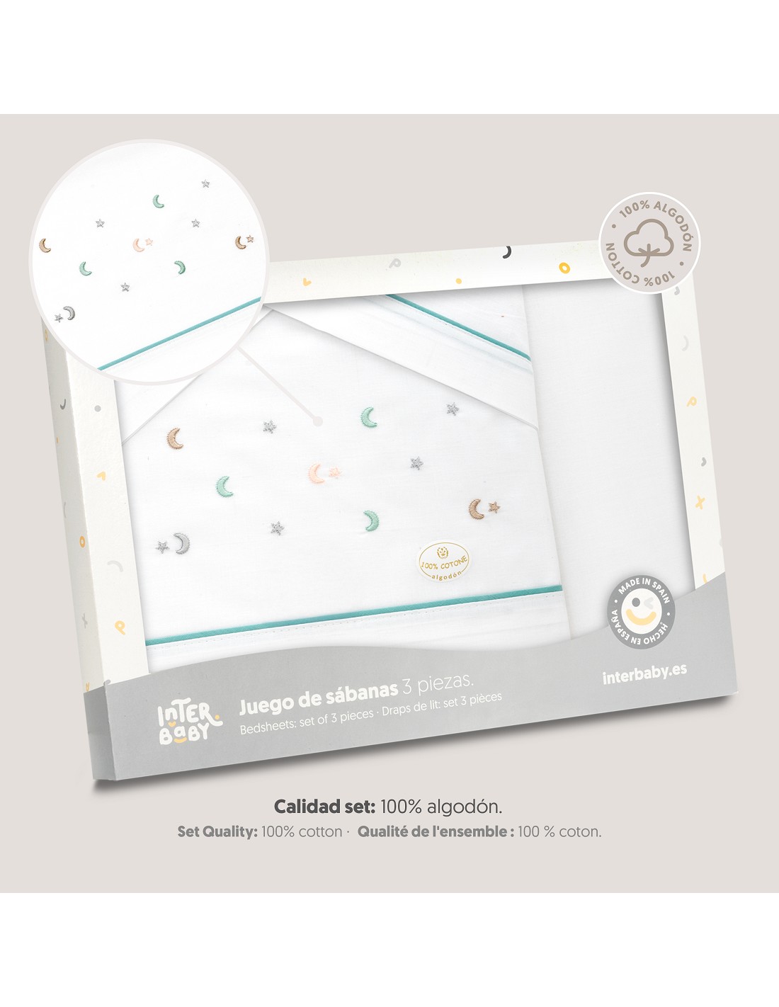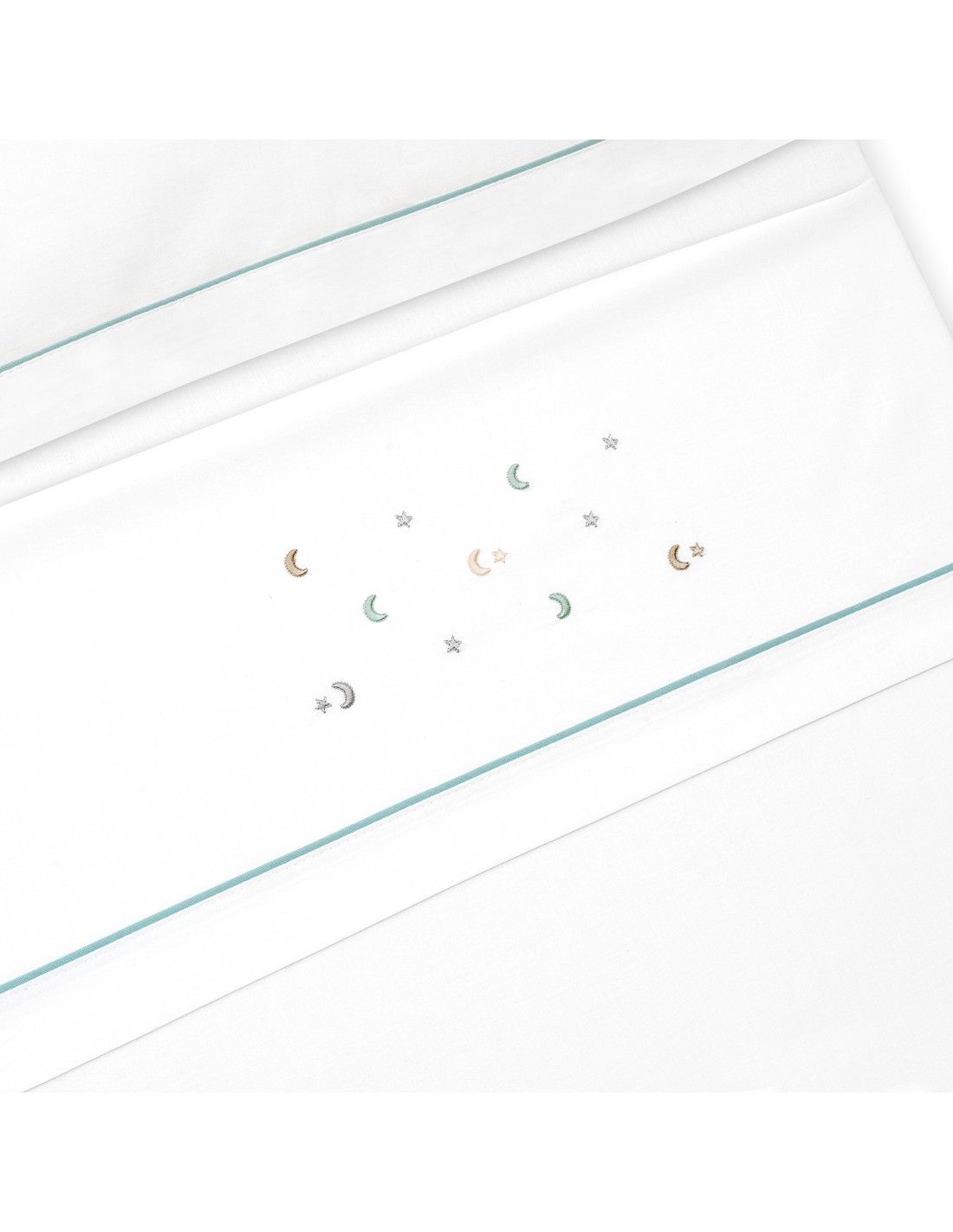 Compuesto por encimera (72 X 114cm) , bajera (40 X 80 cm) y funda de almohada (40 x 25 cm). 100 % algodón. Lavar en frío.