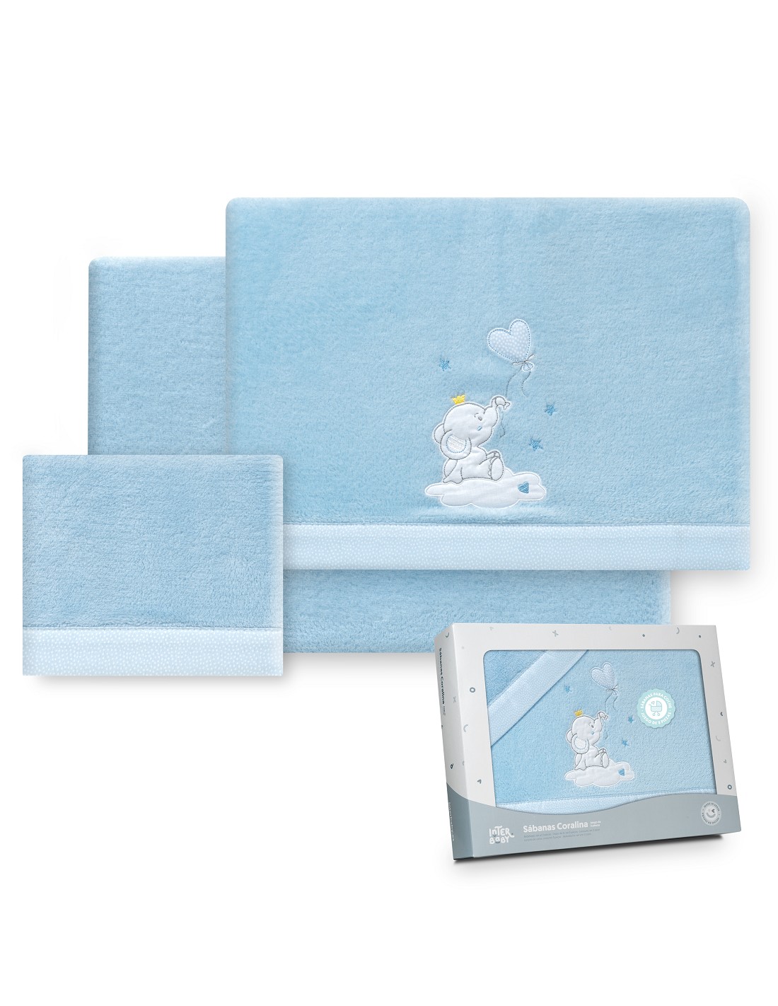 Compuesto por encimera (103 x 150 cm) , bajera (60 x 120 cm) y funda de almohada (60 x 30 cm). 100 % POLIESTER. Lavar en frío.
