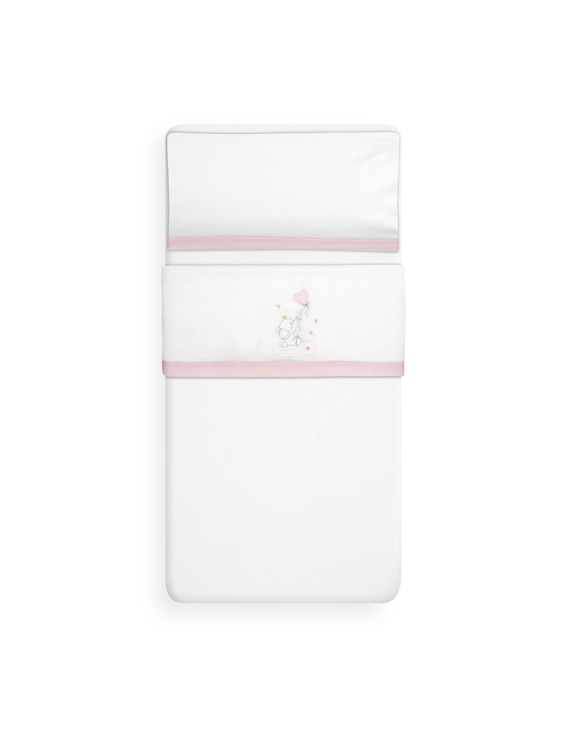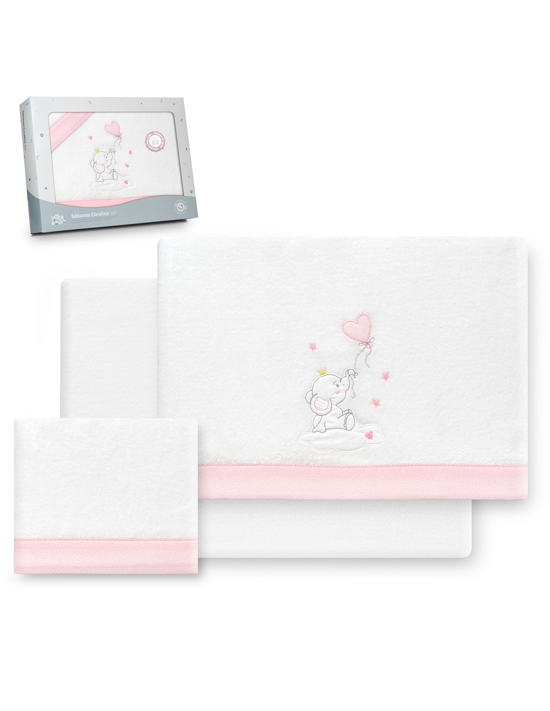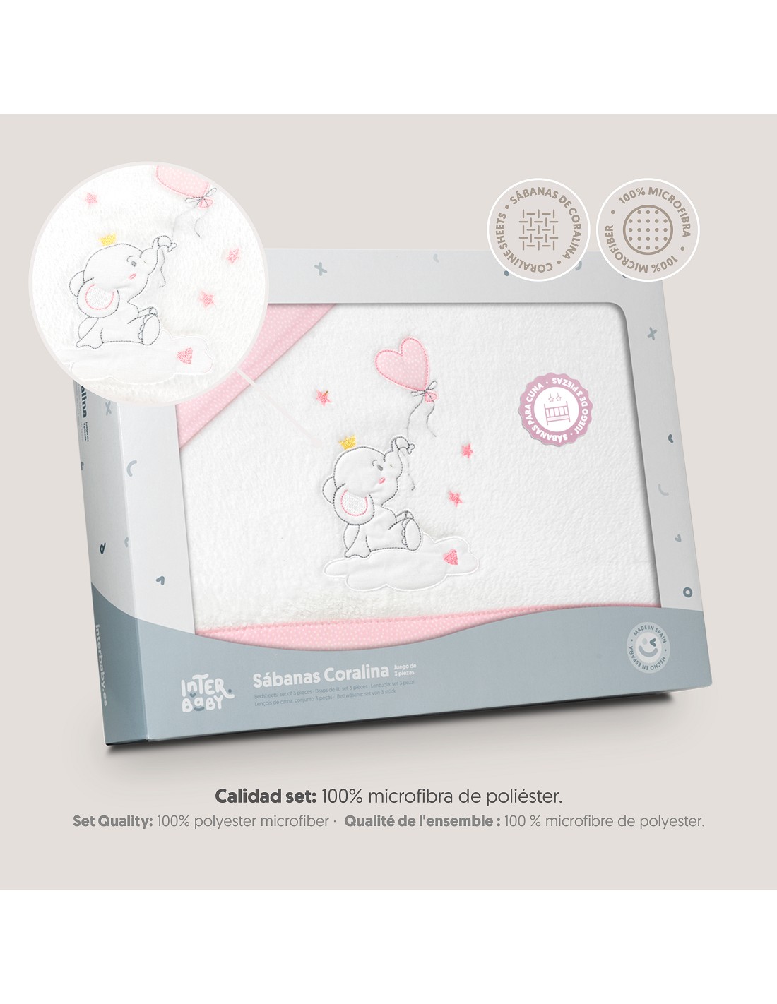 Compuesto por encimera (103 x 150 cm) , bajera (60 x 120 cm) y funda de almohada (60 x 30 cm). 100 % POLIESTER. Lavar en frío.