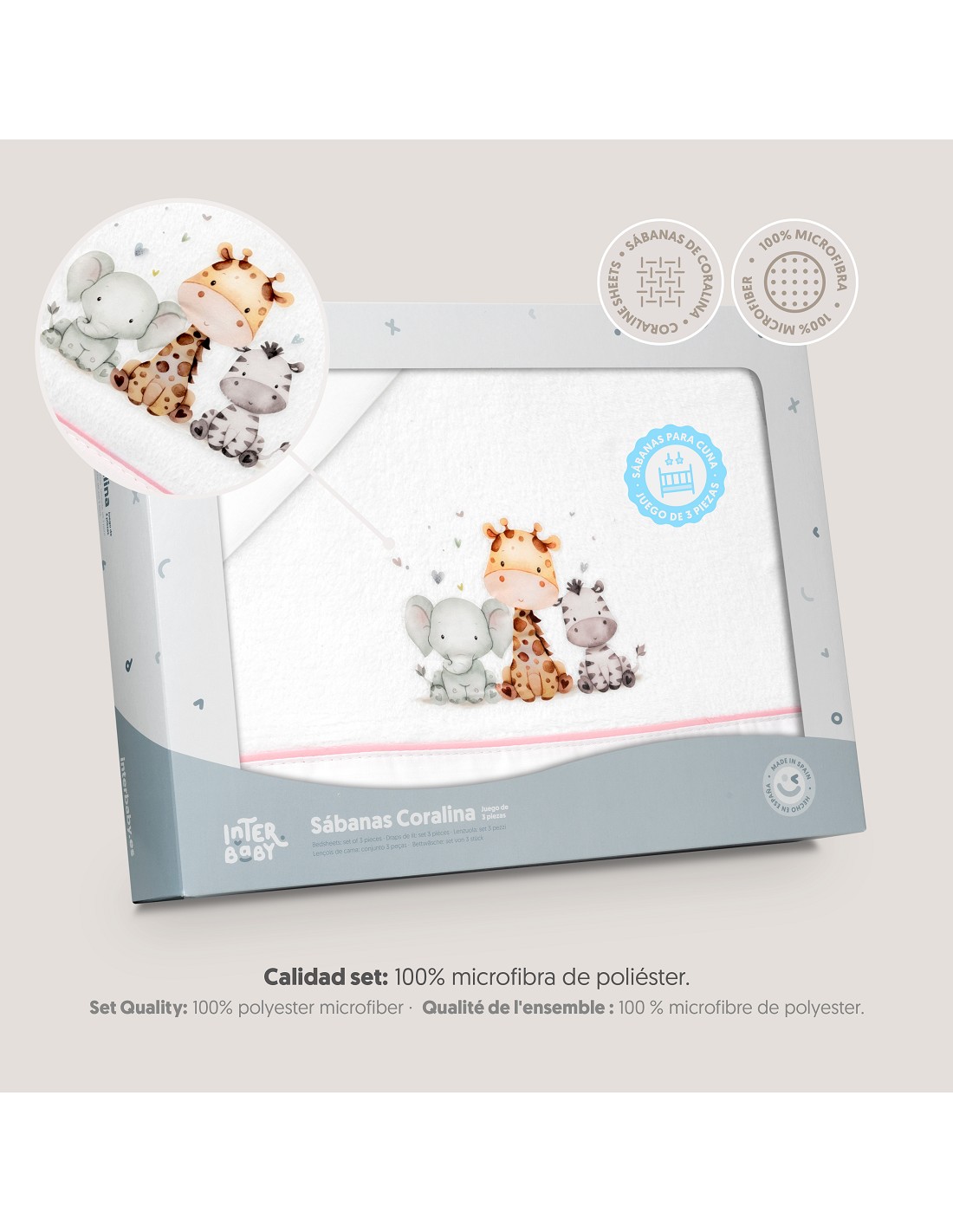 Compuesto por encimera (103 x 150 cm) , bajera (60 x 120 cm) y funda de almohada (60 x 30 cm). 100 % POLIESTER. Lavar en frío.