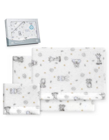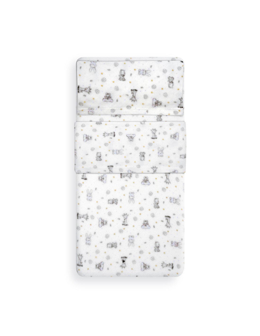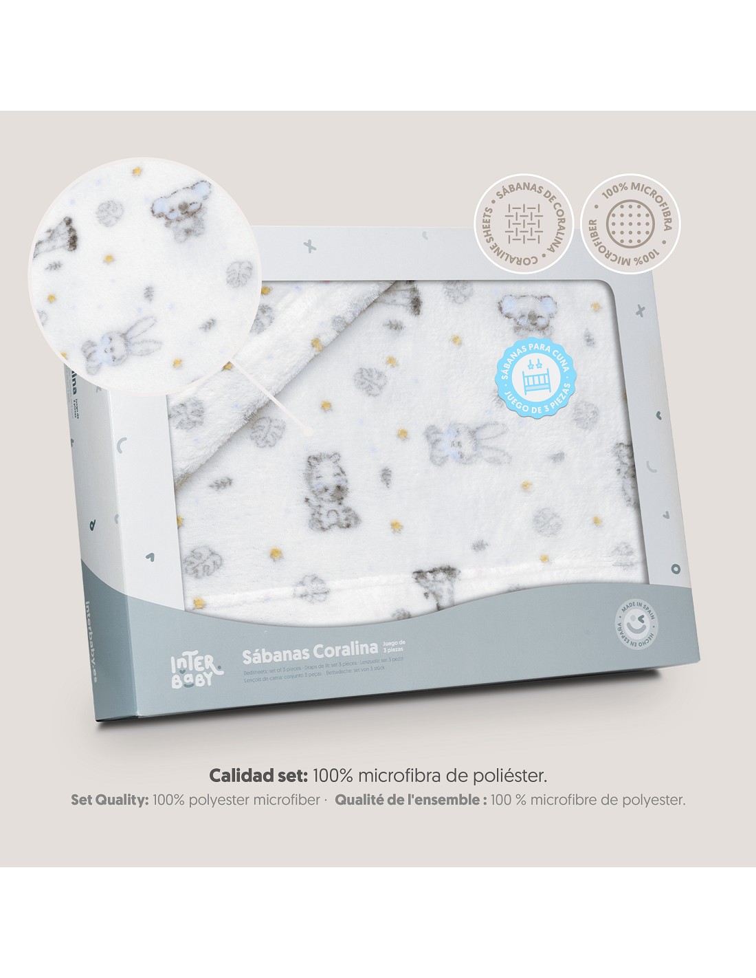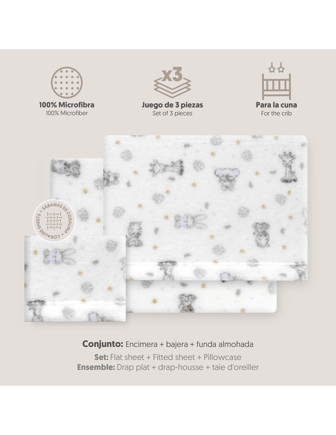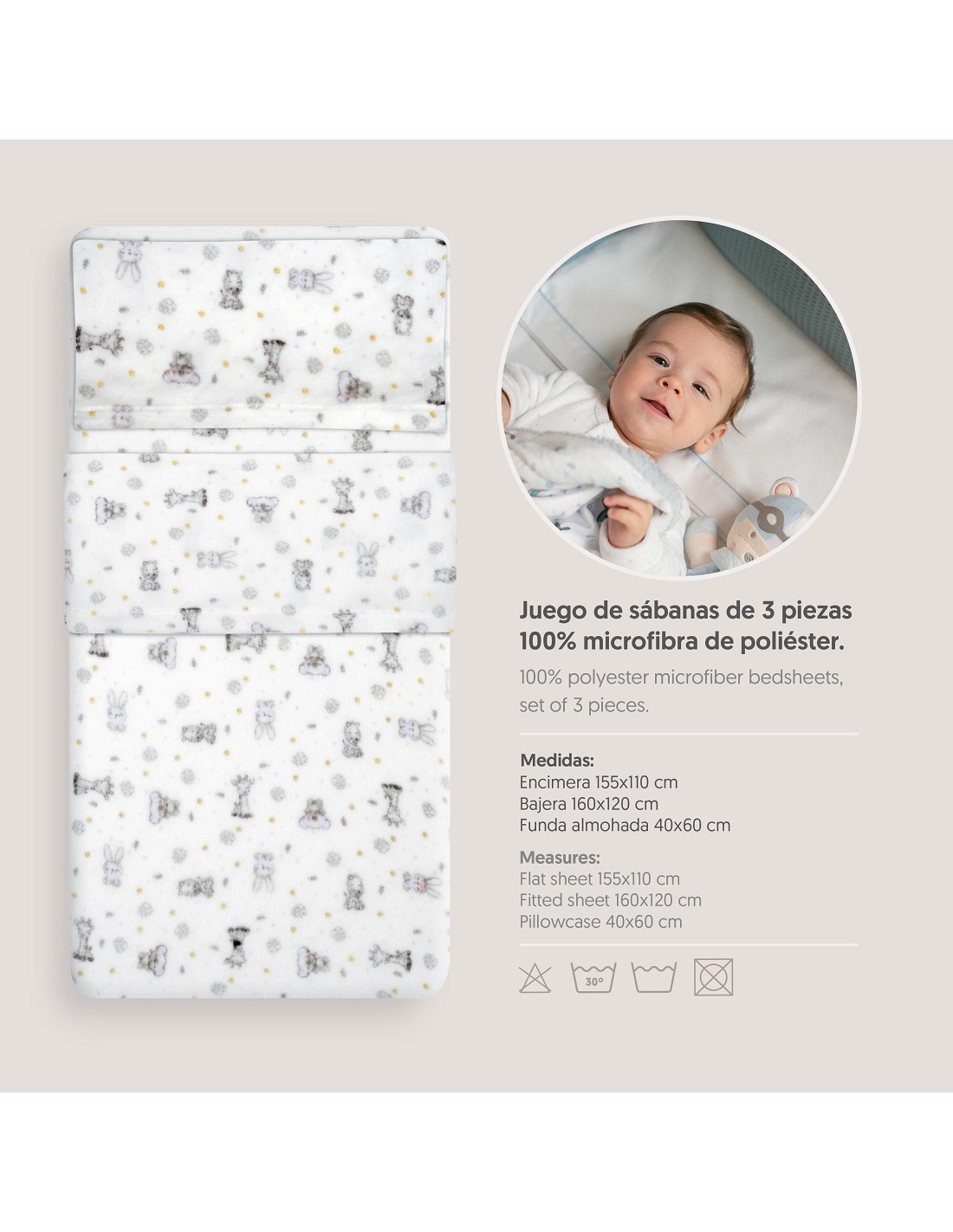 Compuesto por encimera (103 x 150 cm) , bajera (60 x 120 cm) y funda de almohada (60 x 30 cm). 100 % POLIESTER. Lavar en frío.