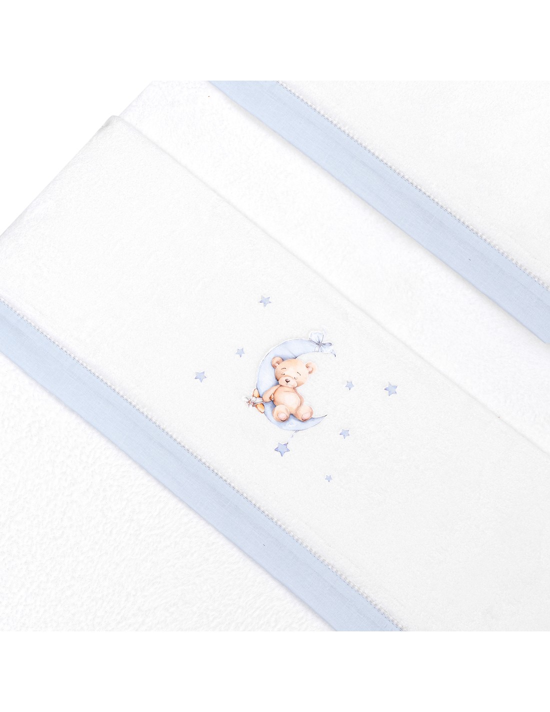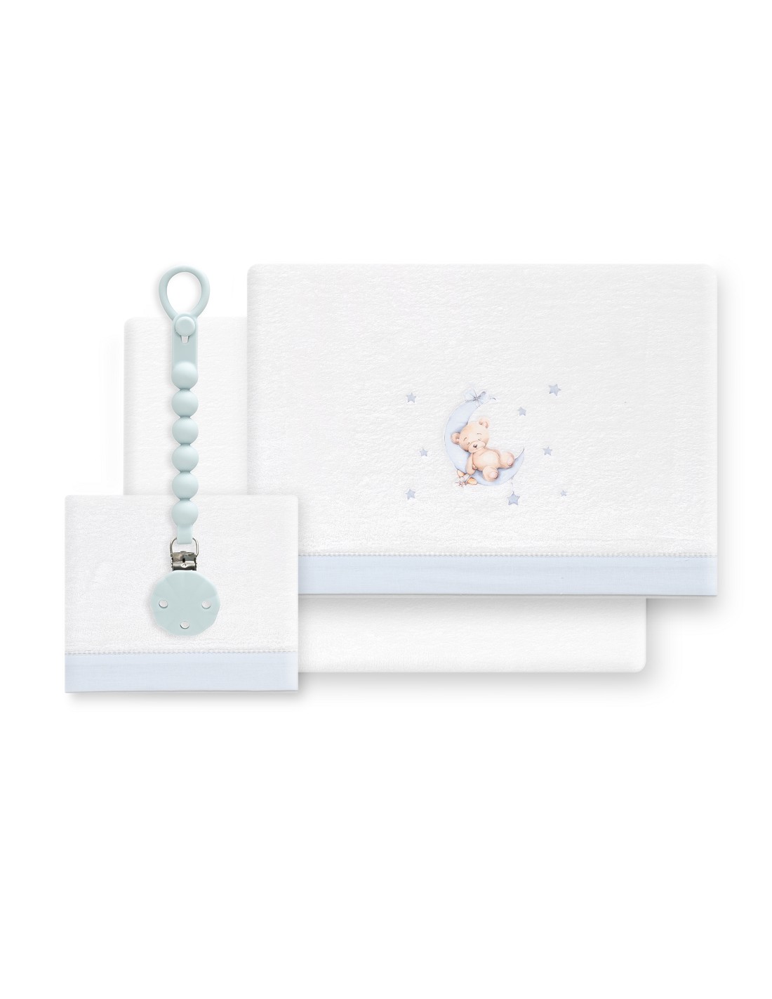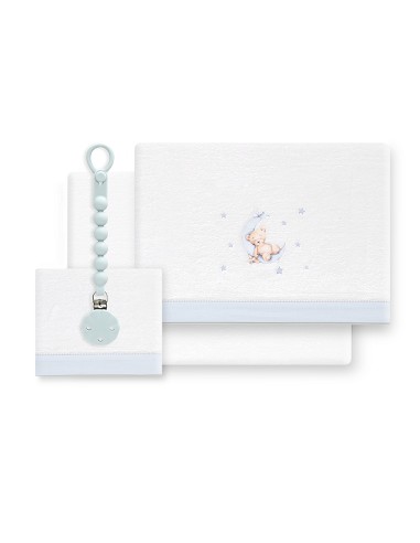 Triptico Cuna Coralina Estampado Oso Luna Estrellas + Broche Bco/Azul