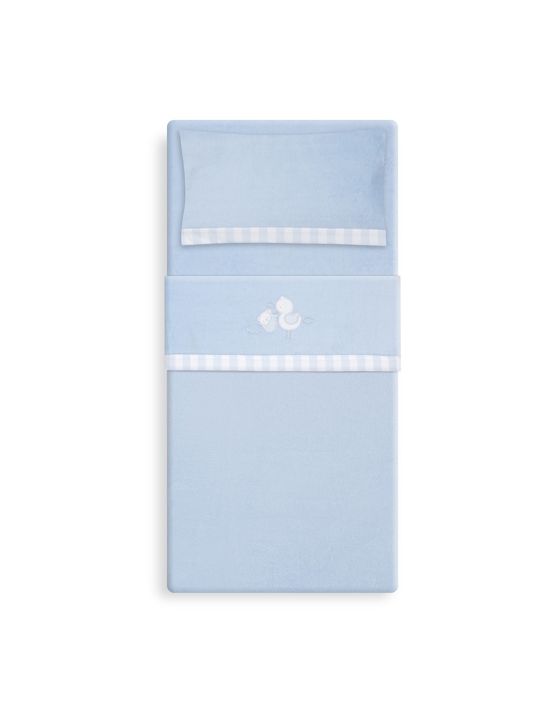 Compuesto por encimera (103 x 150 cm) , bajera (60 x 120 cm) y funda de almohada (60 x 30 cm). 100 % POLIESTER. Lavar en frío.