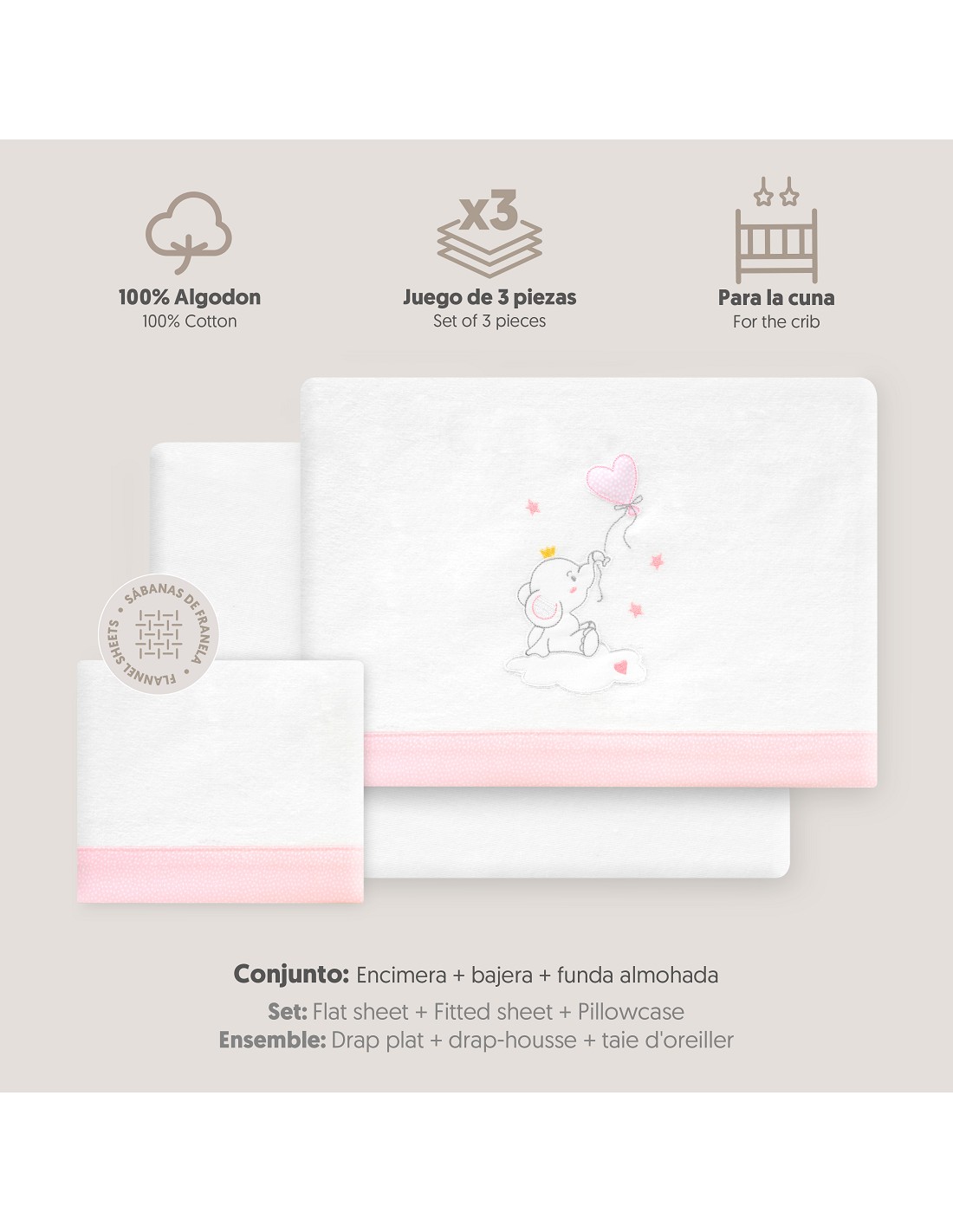 Triptico Cuna Franela Elefante Globo Corazon Bco/Rosa
