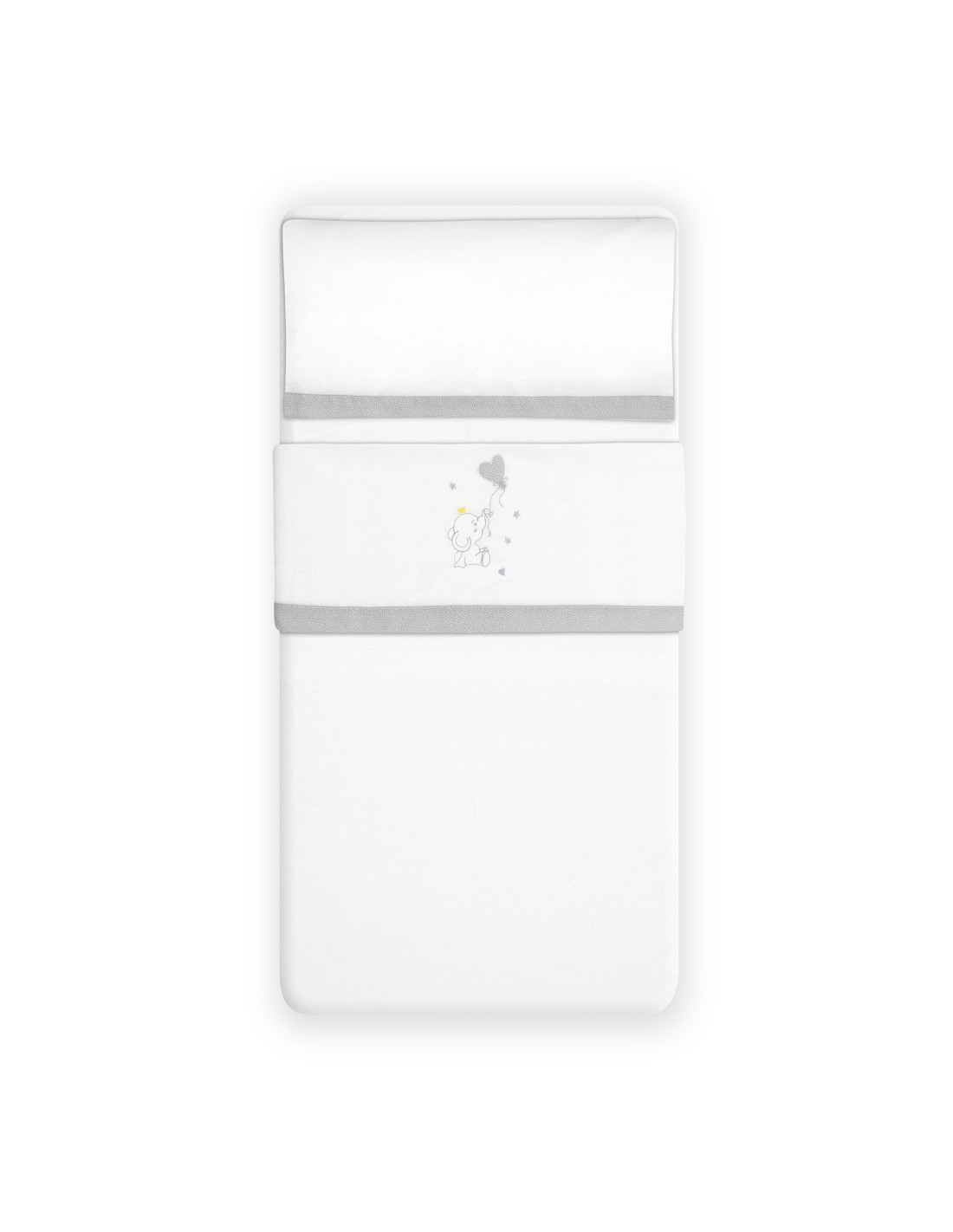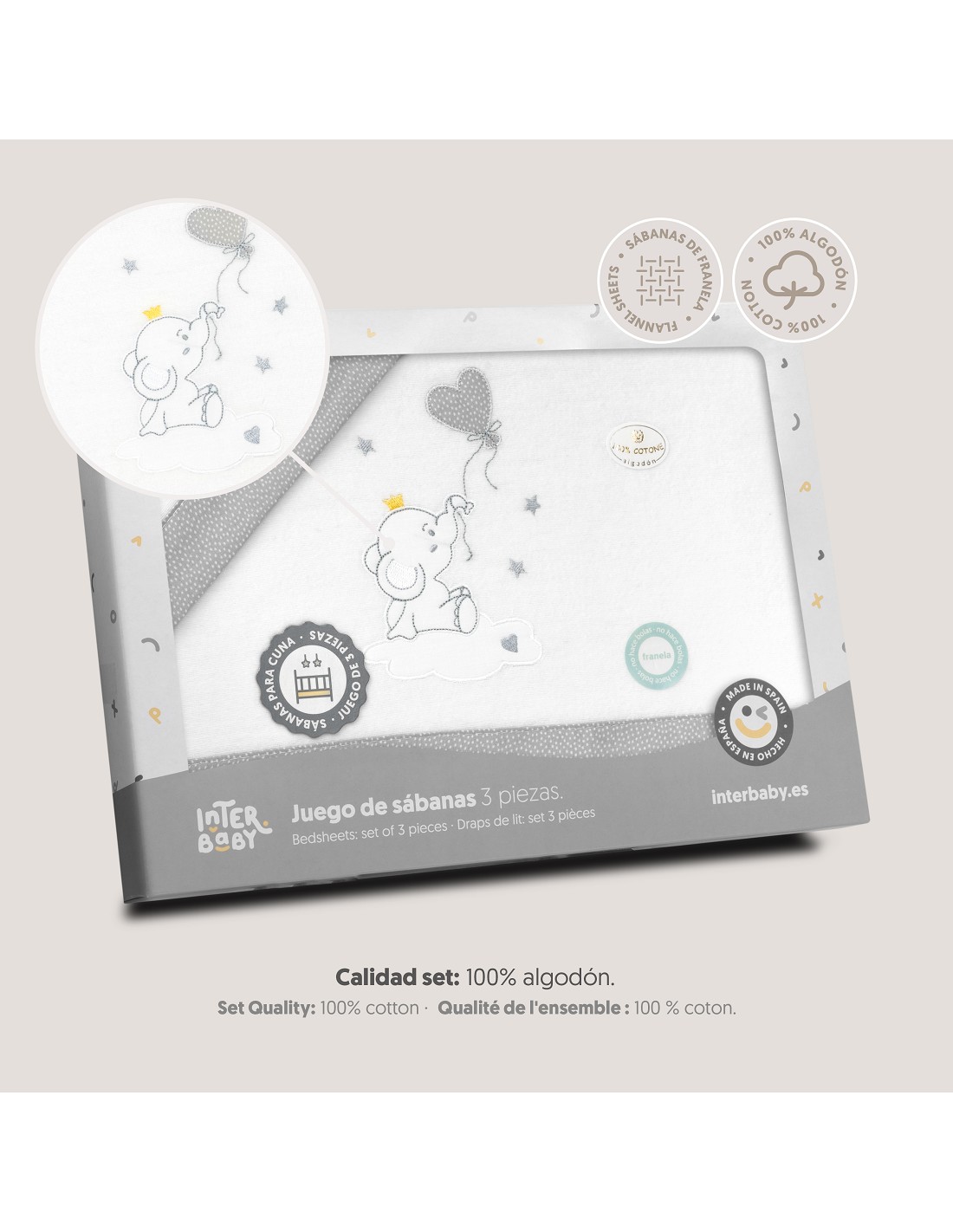 Compuesto por encimera (103 x 150 cm) , bajera (60 x 120 cm) y funda de almohada (60 x 30 cm). 100 % algodón. Lavar en frío.