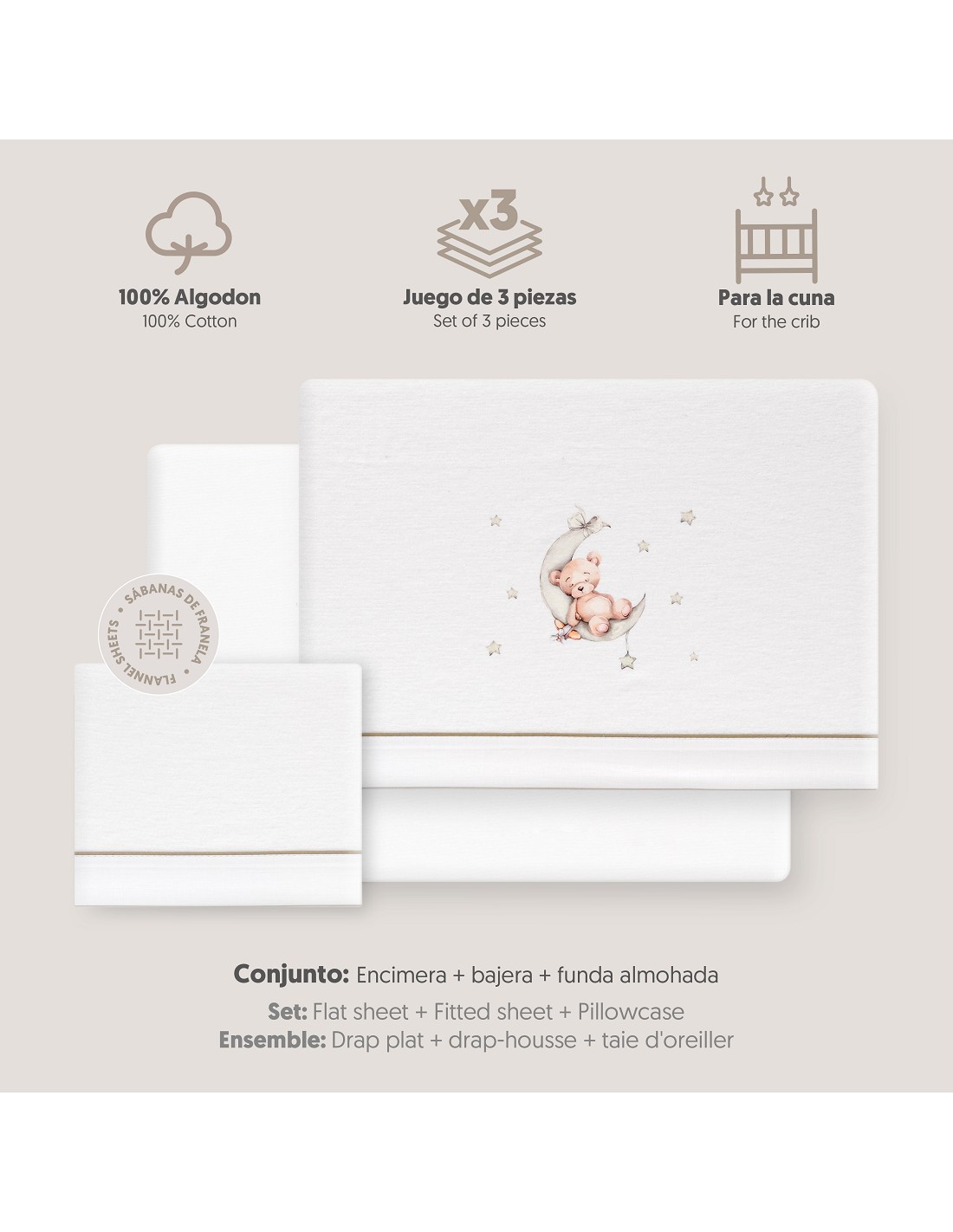 Compuesto por encimera (103 x 150 cm) , bajera (60 x 120 cm) y funda de almohada (60 x 30 cm). 100 % algodón. Lavar en frío.