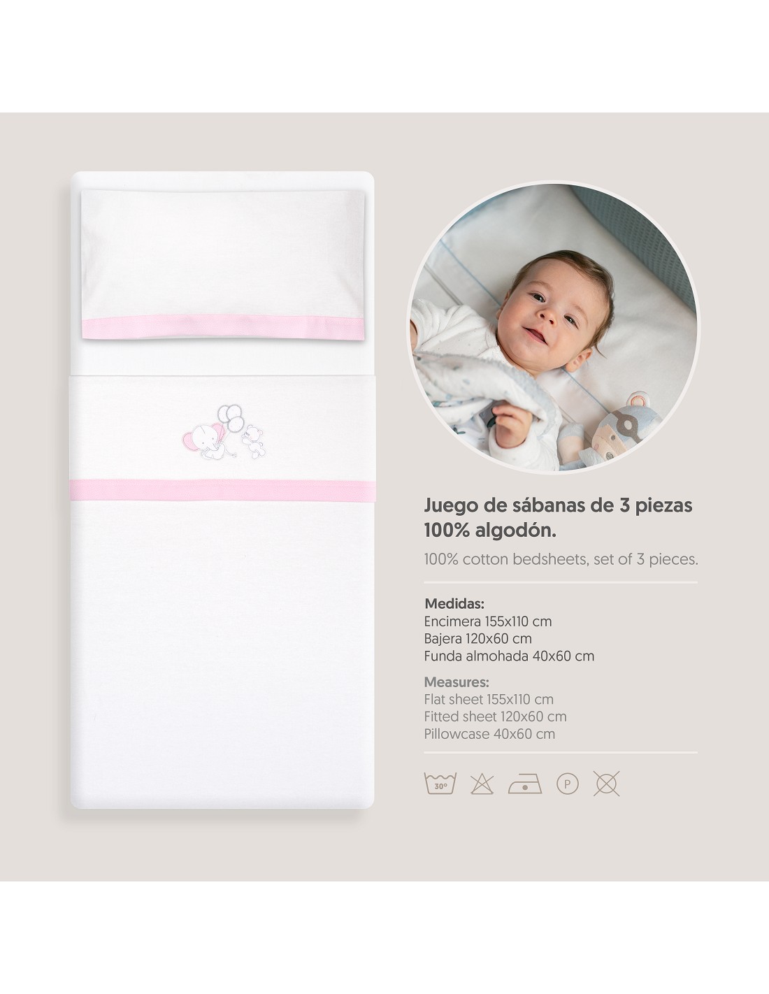 Compuesto por encimera (103 x 150 cm) , bajera (60 x 120 cm) y funda de almohada (60 x 30 cm). 100 % algodón. Lavar en frío.