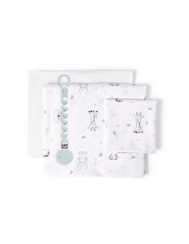 Compuesto por encimera (103 x 150 cm) , bajera (60 x 120 cm) y funda de almohada (60 x 30 cm). 100 % algodón. Lavar en frío.