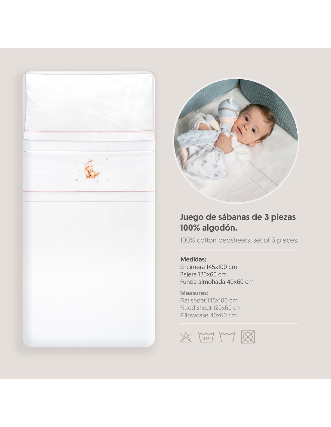 Compuesto por encimera (103 x 150 cm) , bajera (60 x 120 cm) y funda de almohada (60 x 30 cm). 100 % algodón. Lavar en frío.