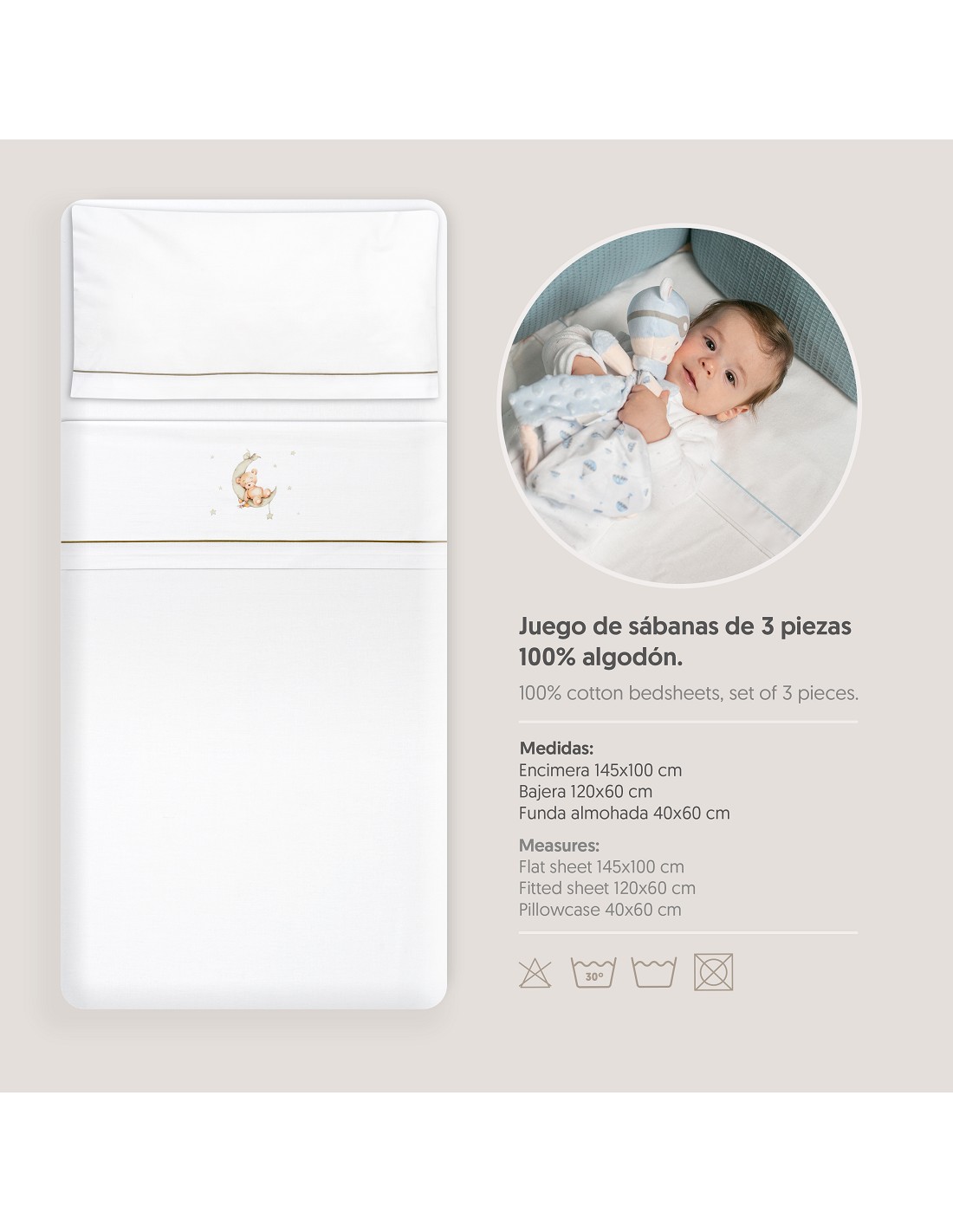 Compuesto por encimera (103 x 150 cm) , bajera (60 x 120 cm) y funda de almohada (60 x 30 cm). 100 % algodón. Lavar en frío.