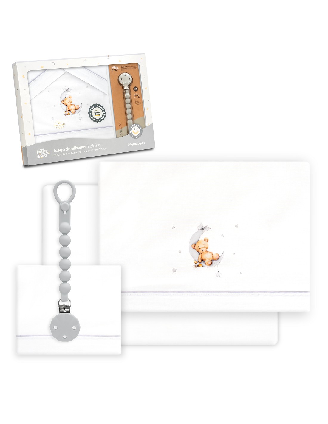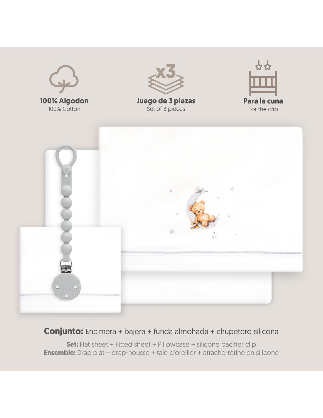 Triptico Cuna Estampado Oso Luna Estrellas + Broche Bco/Gris