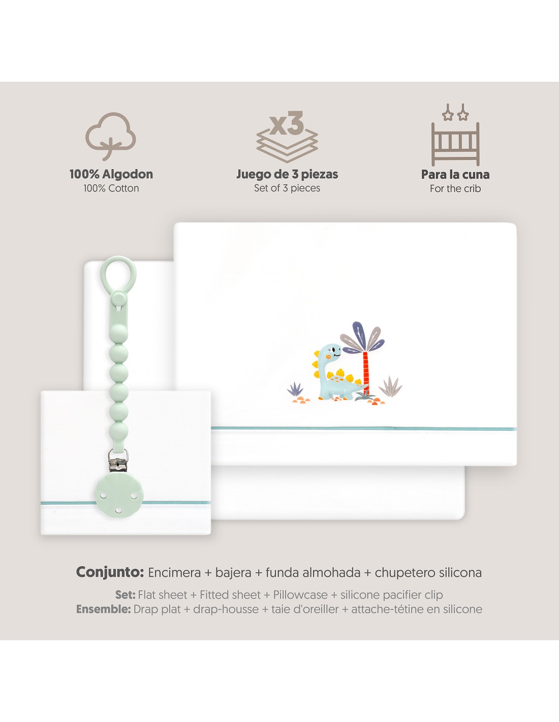 Triptico Cuna Estampado Dinosaurio Palmera + Broche Bco/Verde