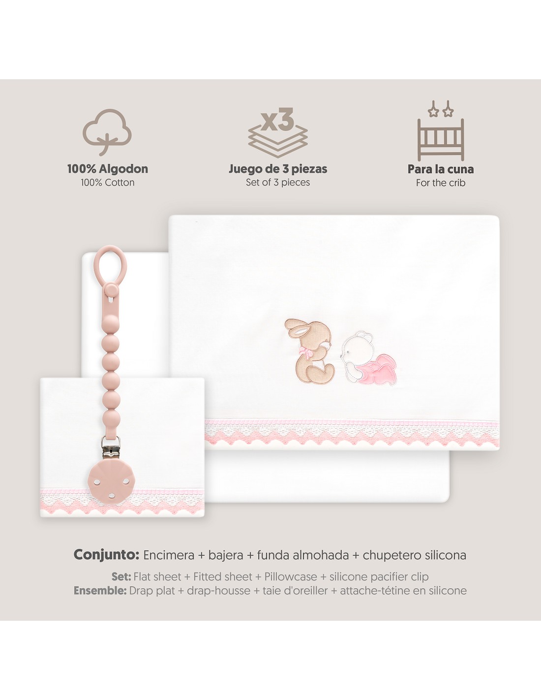 Compuesto por encimera (103 x 150 cm) , bajera (60 x 120 cm) y funda de almohada (60 x 30 cm). 100 % algodón. Lavar en frío.