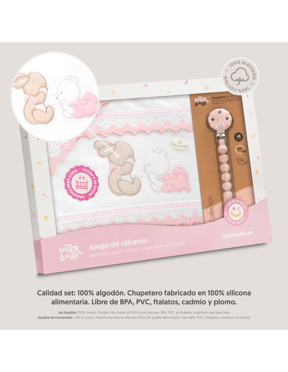 Triptico Cuna Guipur Oso Tumbado Conejito + Broche Bco/Rosa
