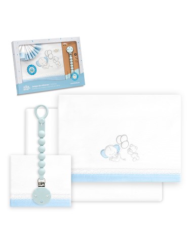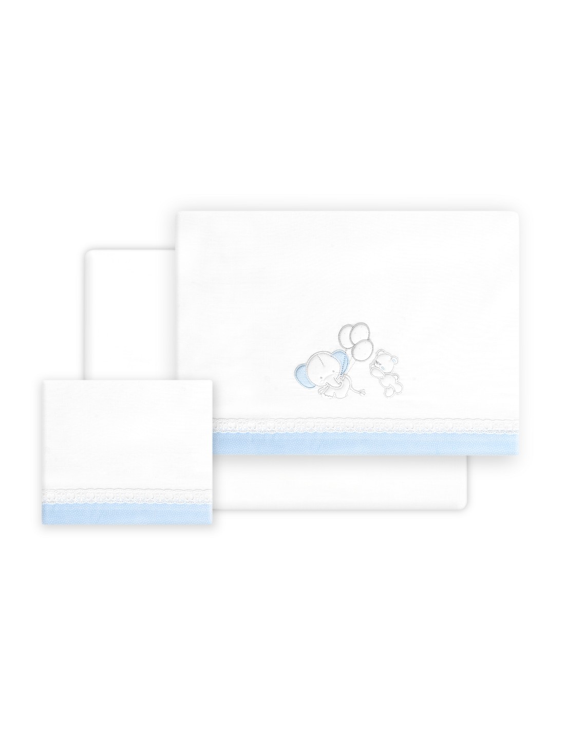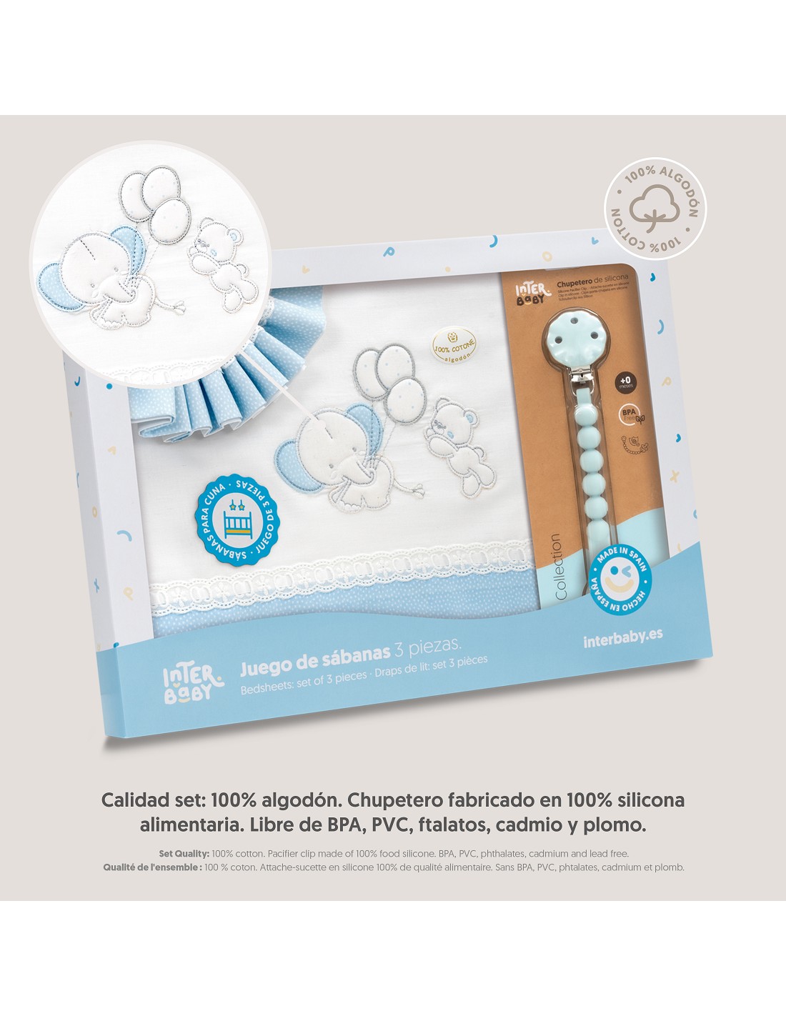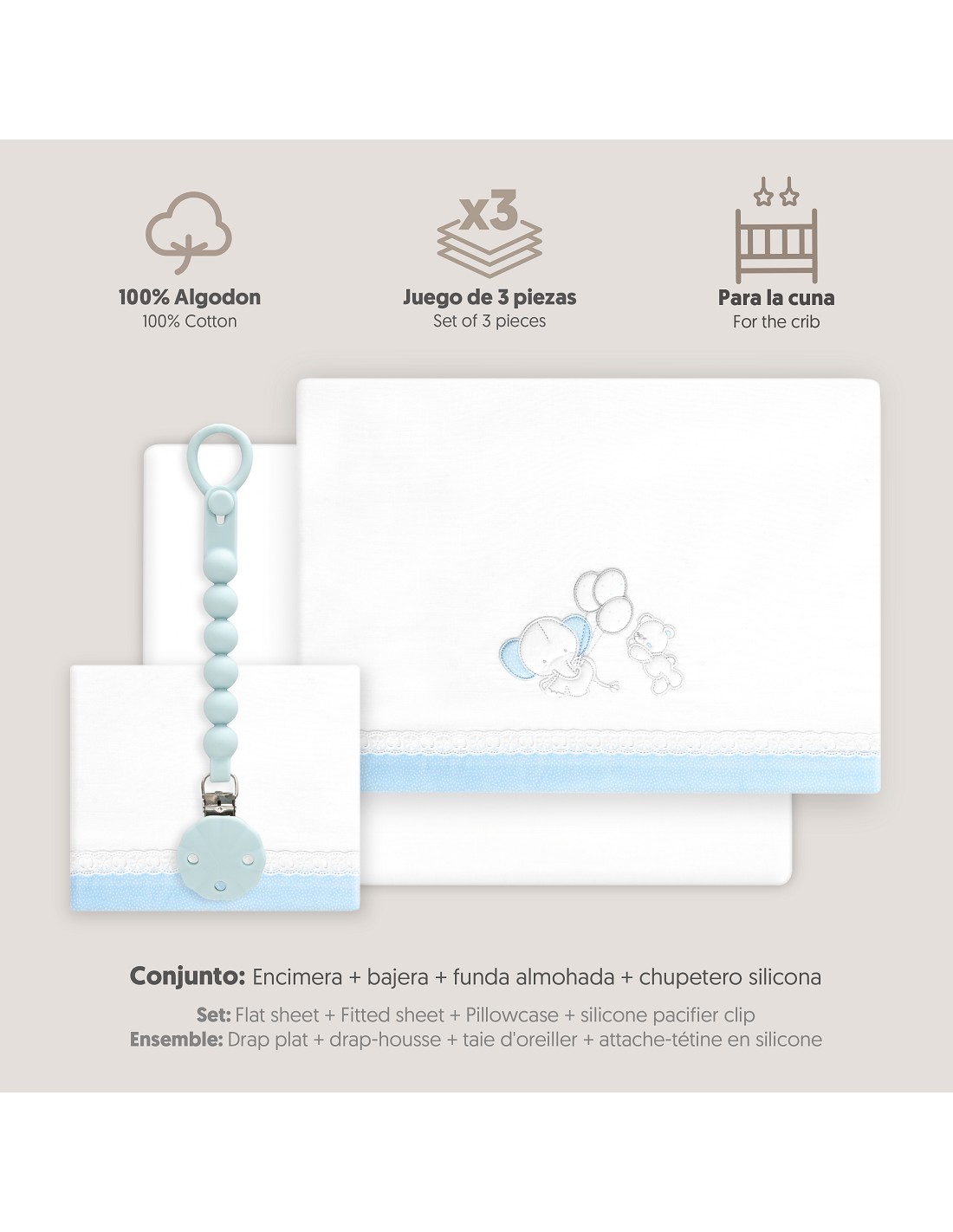 Compuesto por encimera (103 x 150 cm) , bajera (60 x 120 cm) y funda de almohada (60 x 30 cm). 100 % algodón. Lavar en frío.
