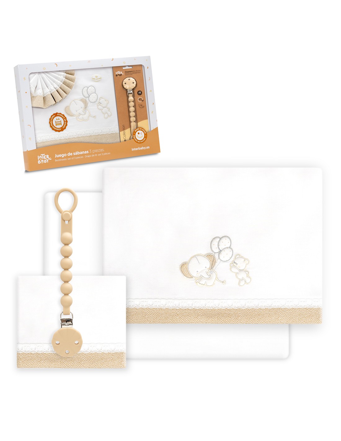 Triptico Cuna Pasacinta Oso Elefante Globos +Broche Bco/Beig