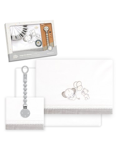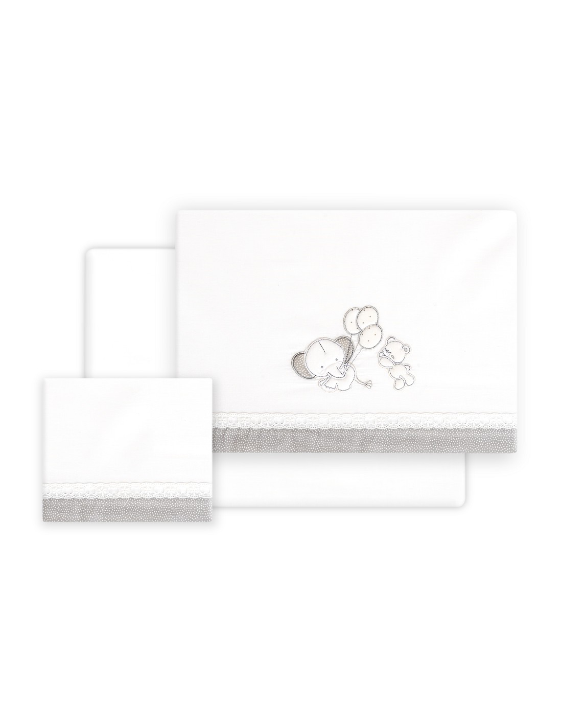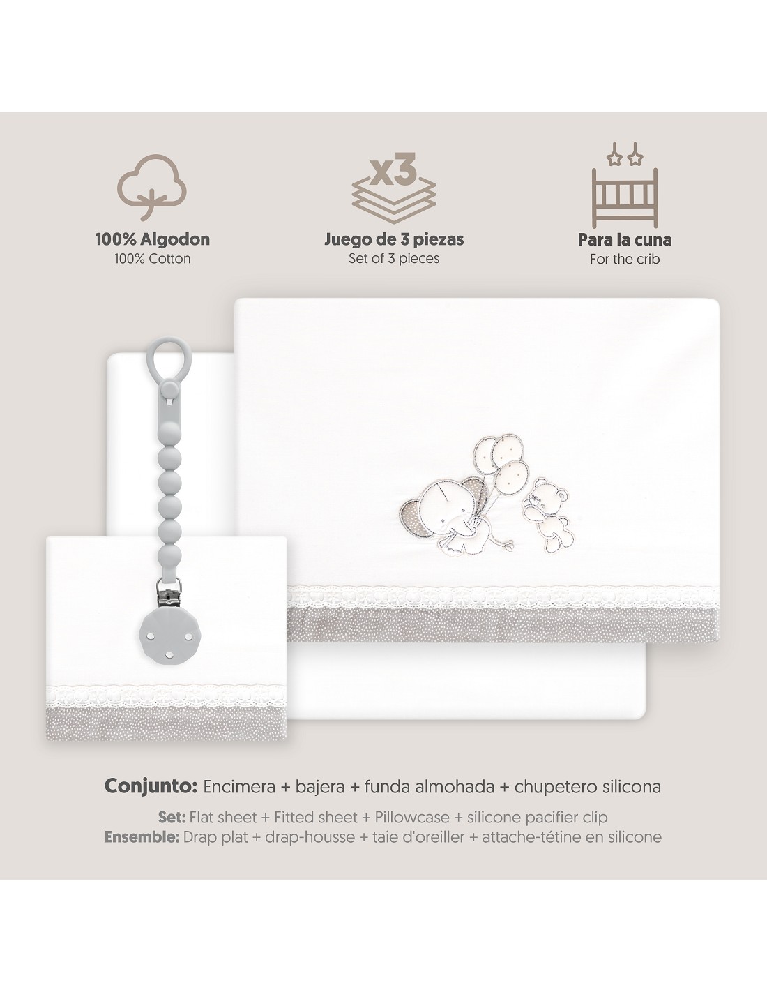 Compuesto por encimera (103 x 150 cm) , bajera (60 x 120 cm) y funda de almohada (60 x 30 cm). 100 % algodón. Lavar en frío.
