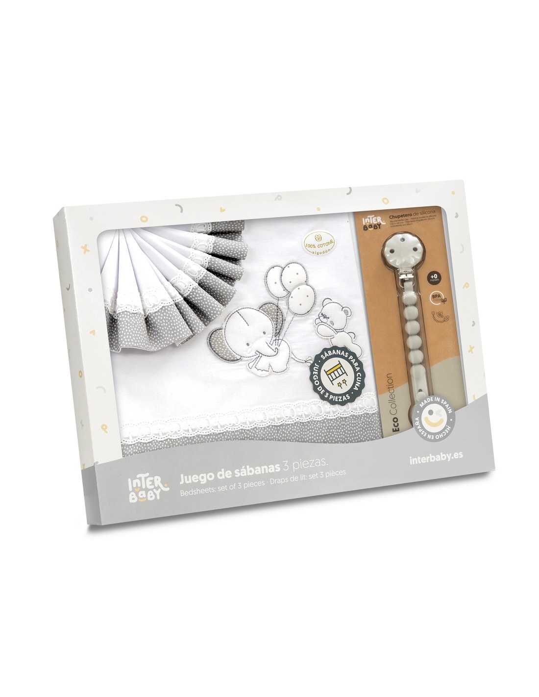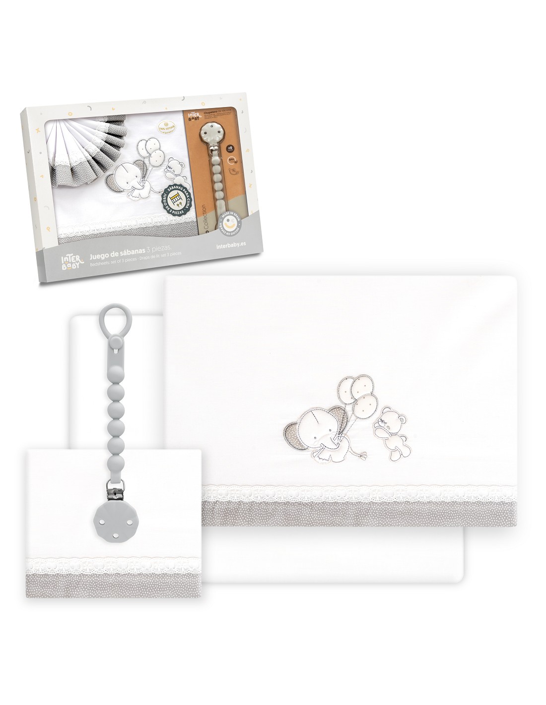 Triptico Cuna Pasacinta Oso Elefante Globos +Broche Bco/Gris