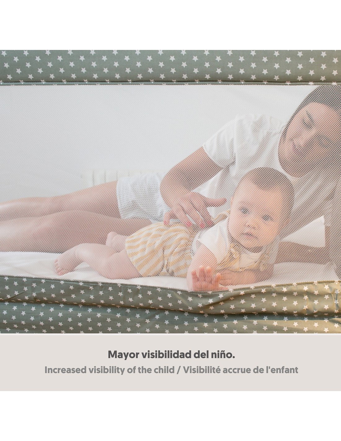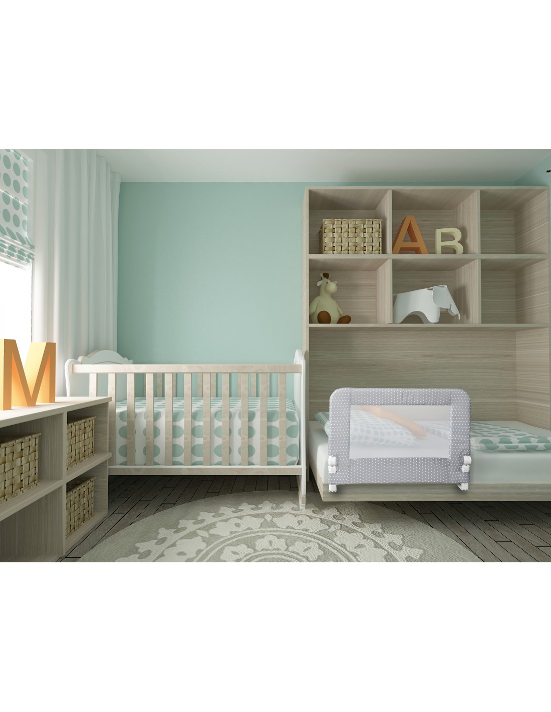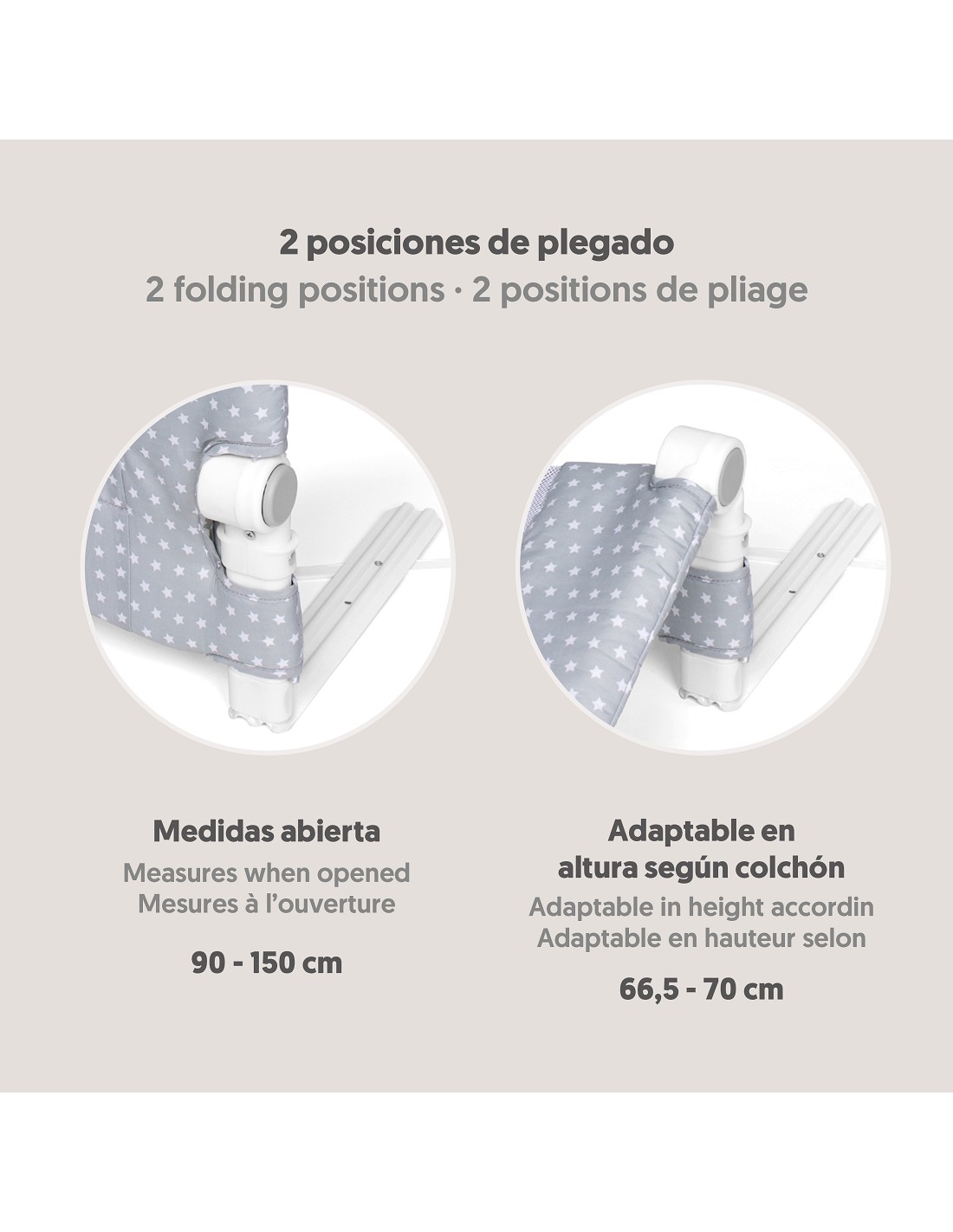 Barrera cama abatible de 90 cm de largo. Comodidad para hacer la cama no es necesaria extraerla. Adaptable hasta 3,5 cm en altura para mejor ajuste con colchón. Desenfundable para ser lavada. Fácil montaje. Incluye cintas de sujeccion al somier. Incluye bolsa viaje.