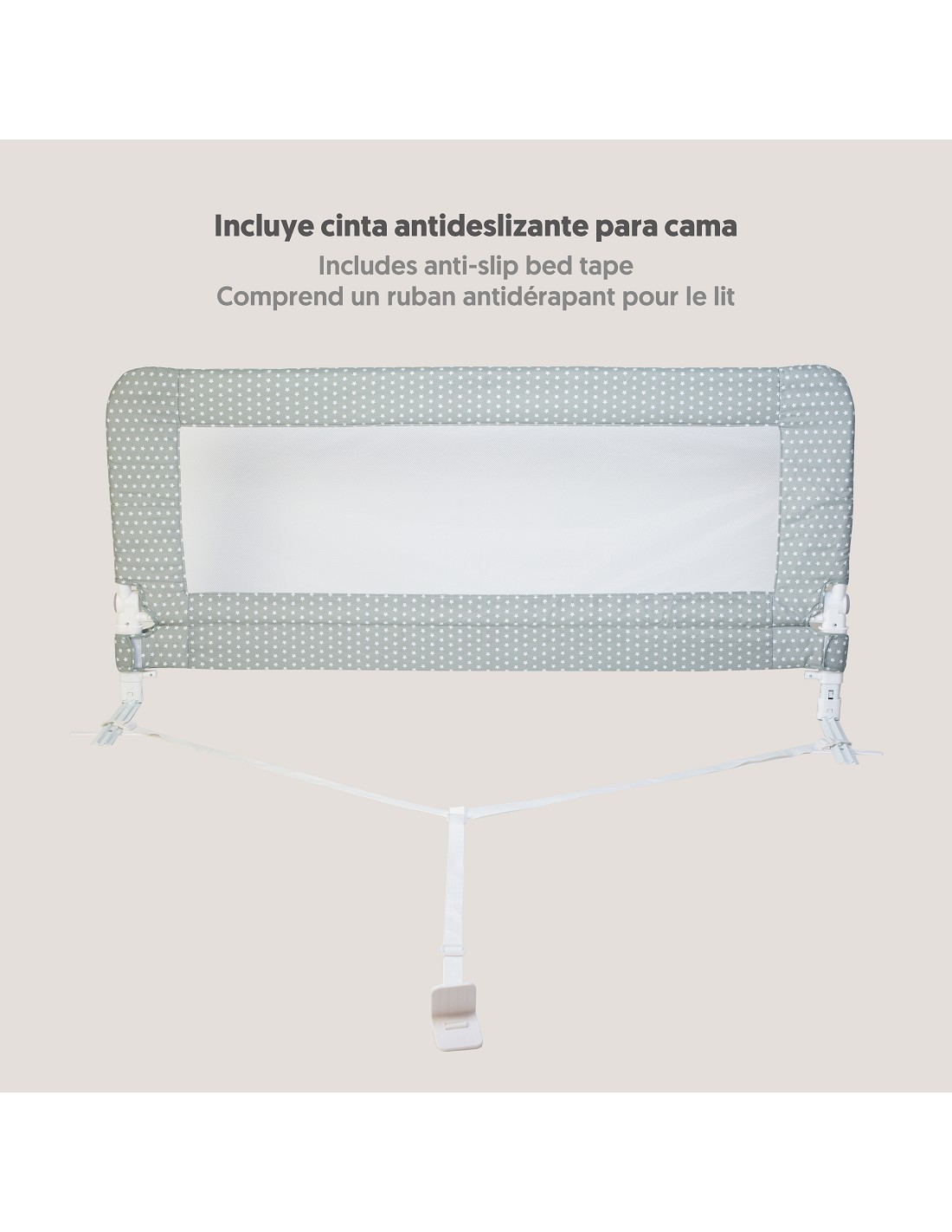 Barrera cama abatible de 150 cm de largo. Comodidad para hacer la cama no es necesaria extraerla. Adaptable hasta 3,5 cm en altura para mejor ajuste con colchón. Desenfundable para ser lavada. Fácil montaje. Incluye cintas de sujeccion al somier. Incluye bolsa viaje
