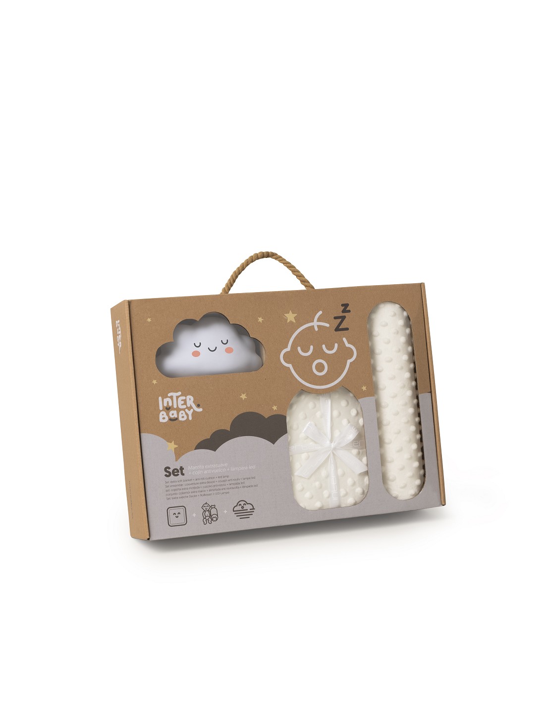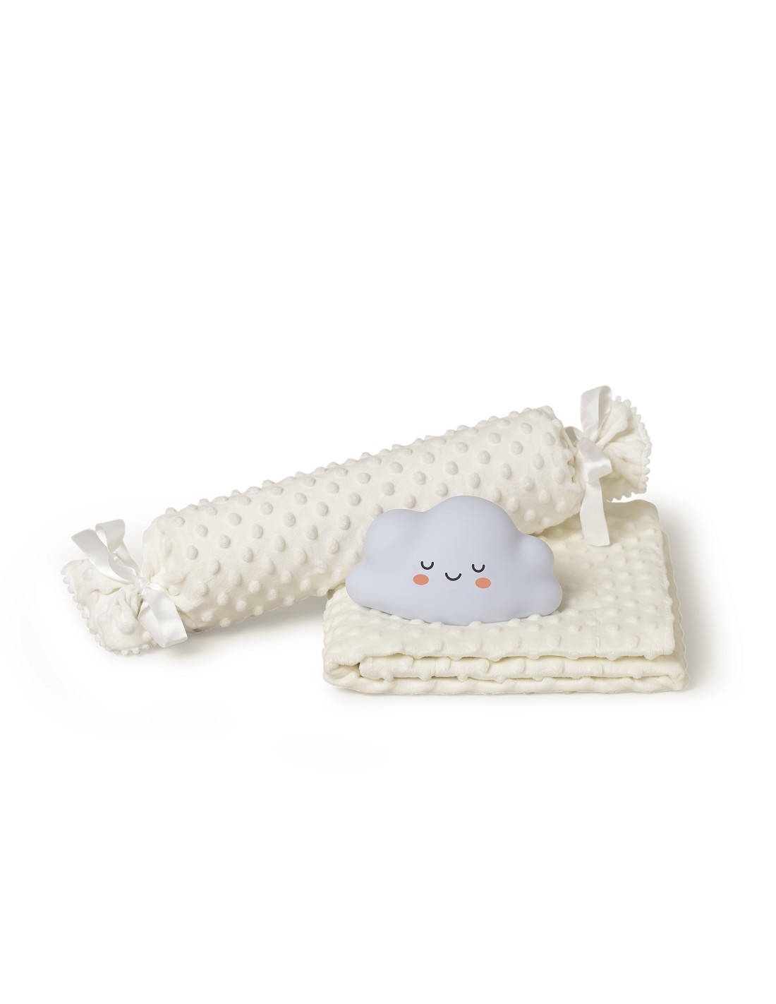 Set Manta de terciopelo para cuna acabado en burbuja y borreguillo. Fabricado en microfibra de alta calidad para dotar a tu bebé de una sensación térmica muy agradable. Cojín antivuelco y una lamparita quitamiedos con el que se sentirá seguro por las noches.