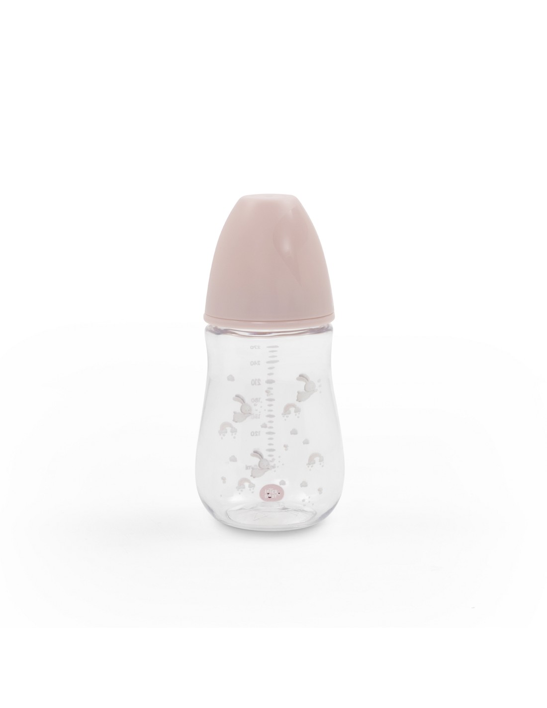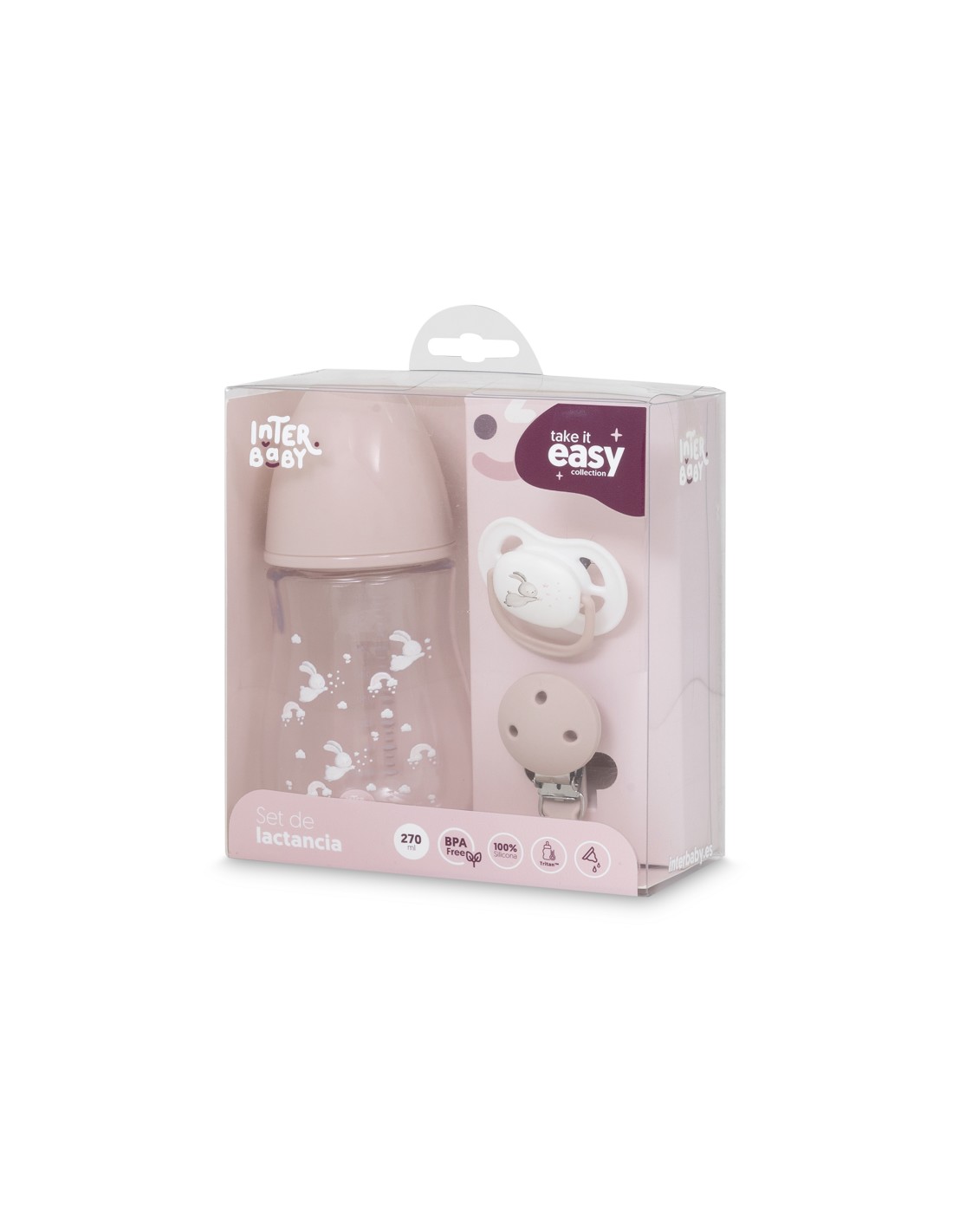 Set Lactancia 3 piezas: biberón + chupete + broche. Biberón 270 ml + chupete y broche silicona.. Tetina anticólicos y antigoteo.