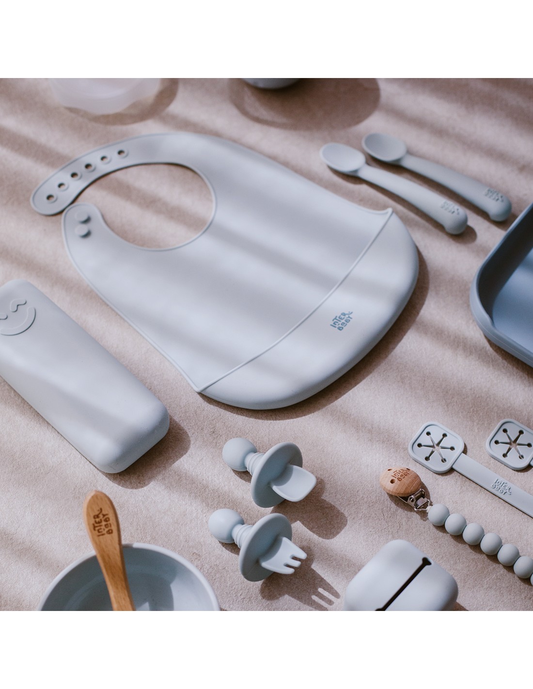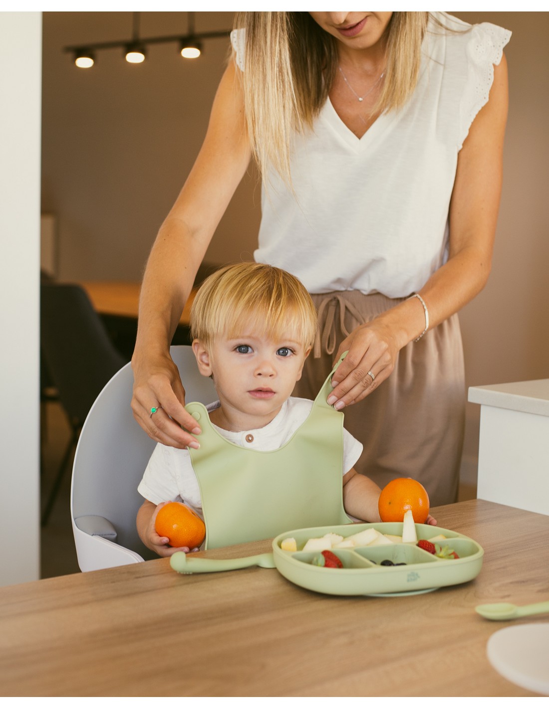 Babero de silicona alimentaria de alta calidad que incorpora un bolsillo recogemigas, perfecto para proteger la ropa de tu bebé. Flexible y se puede doblar fácilmente para reducir el espacio de almacenaje. Apto para lavavajillas. Libre de BPA, PVC y ftalatos.