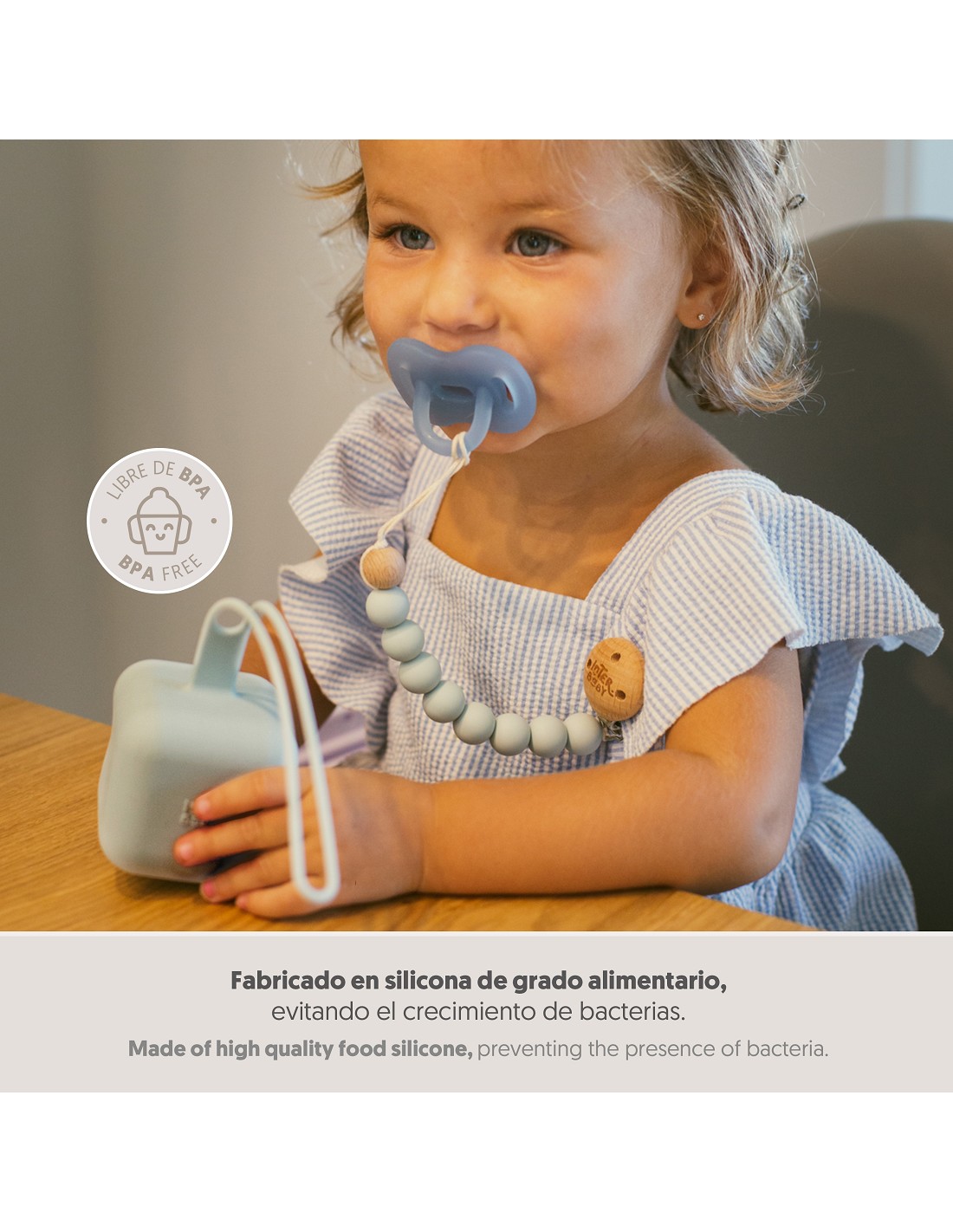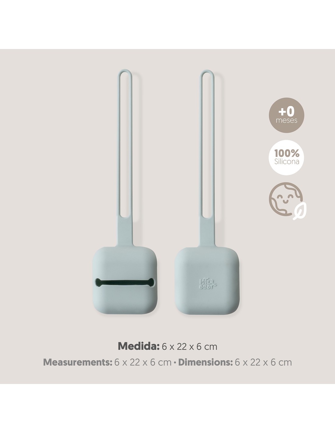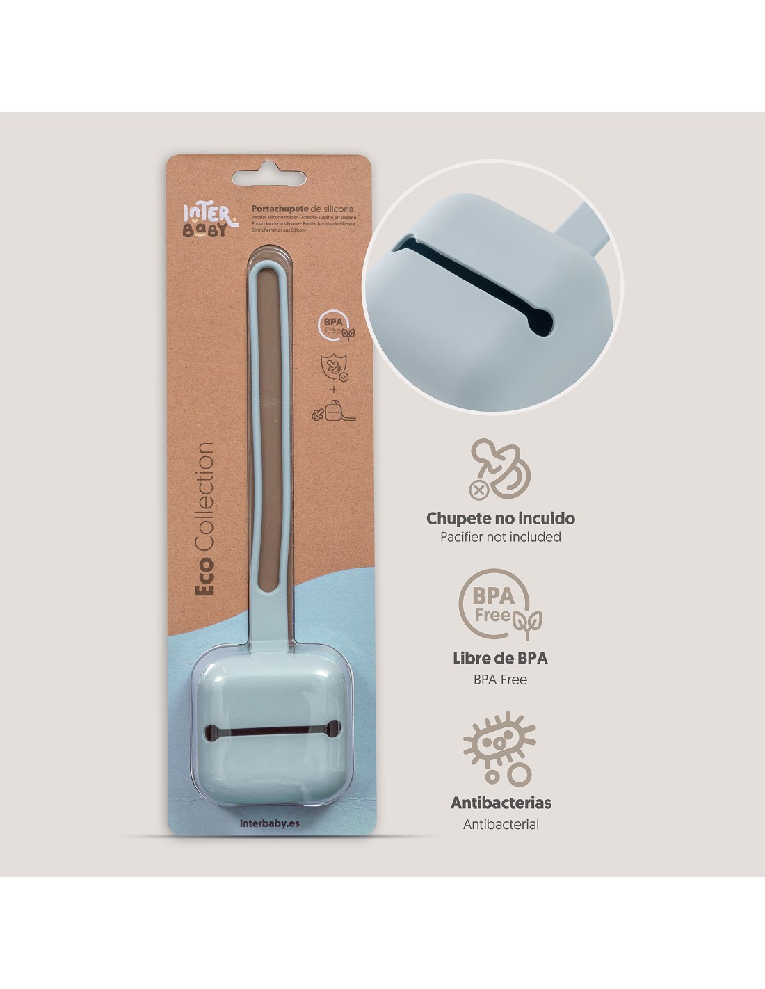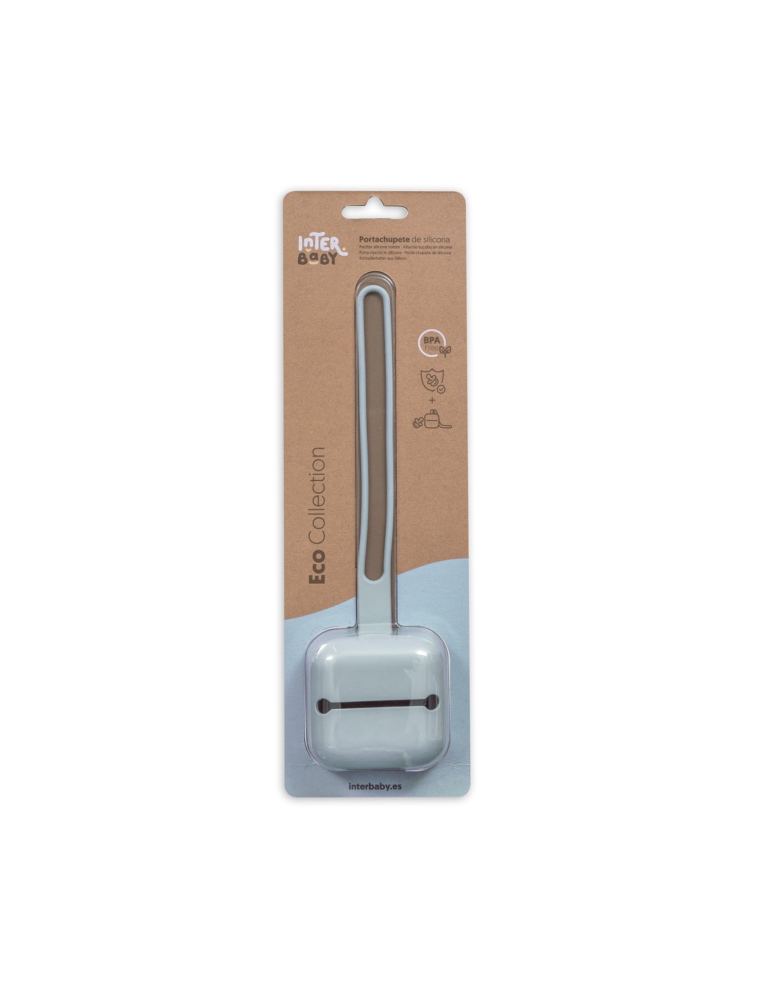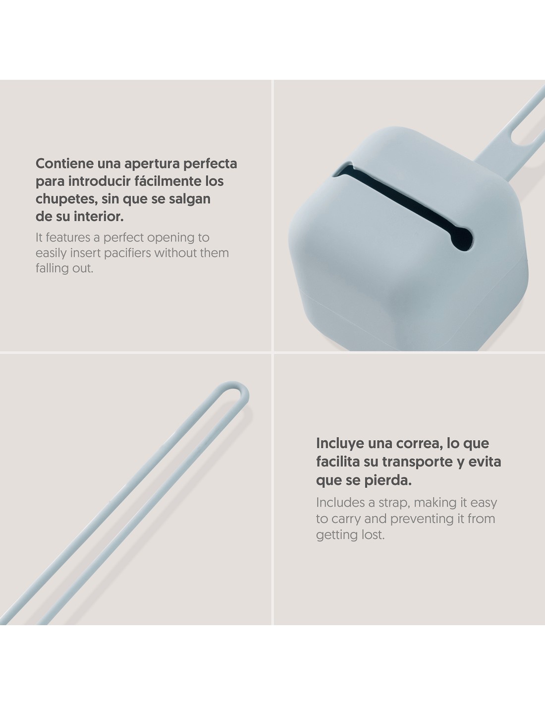 Portachupetes de silicona diseñado para llevarlo colgado en el carrito y tenerlo siempre a mano. No incluye el chupete. Apto para lavavajillas. Libre de BPA, PVC y ftalatos.