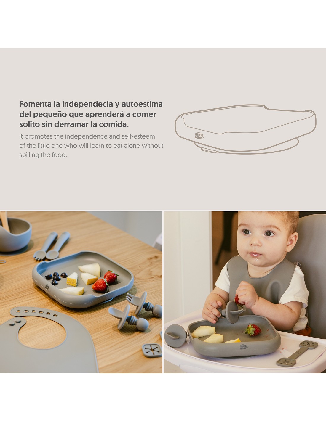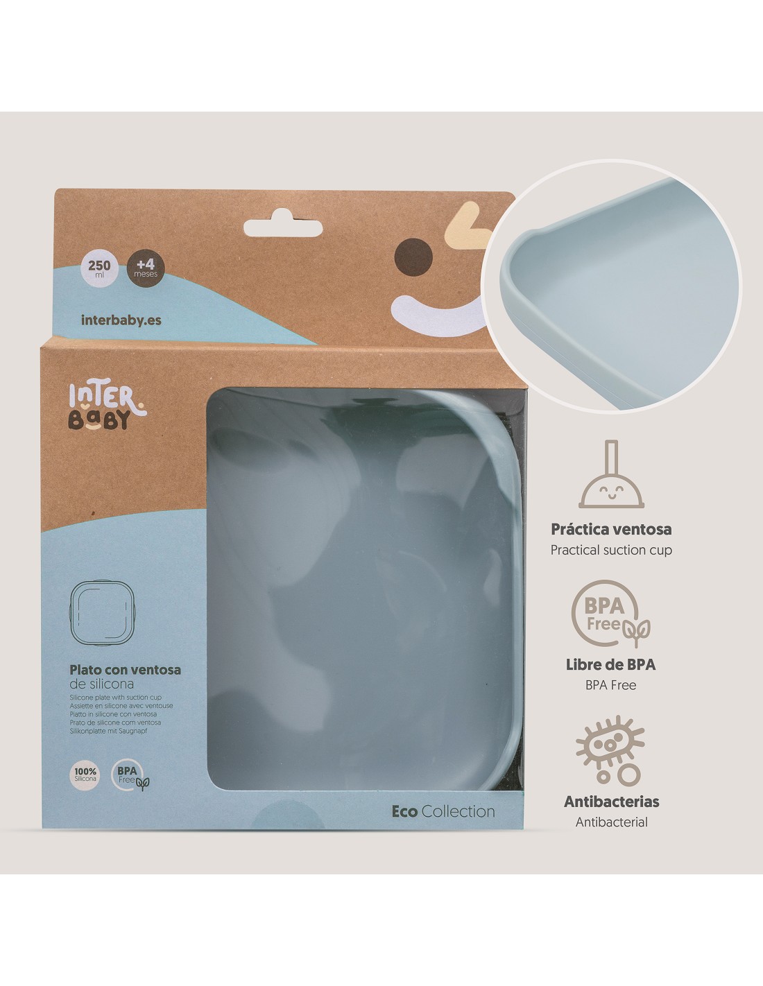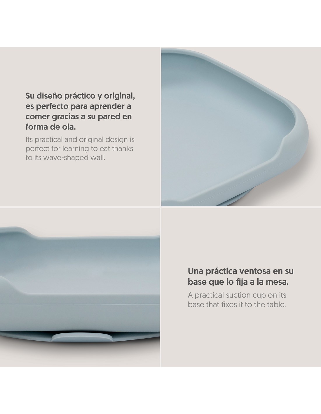 Práctico plato de silicona que incorpora ventosas para una perfecta fijación a la superficie evitando accidentes. Su diseño ayuda a tu bebé en la iniciación en tomar los alimentos por sí mismos. Fácil limpieza y muy resistente. Libre de posibles infecciones al estar fabricado en silicona libre de BPA, PVC, Vinilo, Plomo y ftalatos. Apto para lavavajillas.