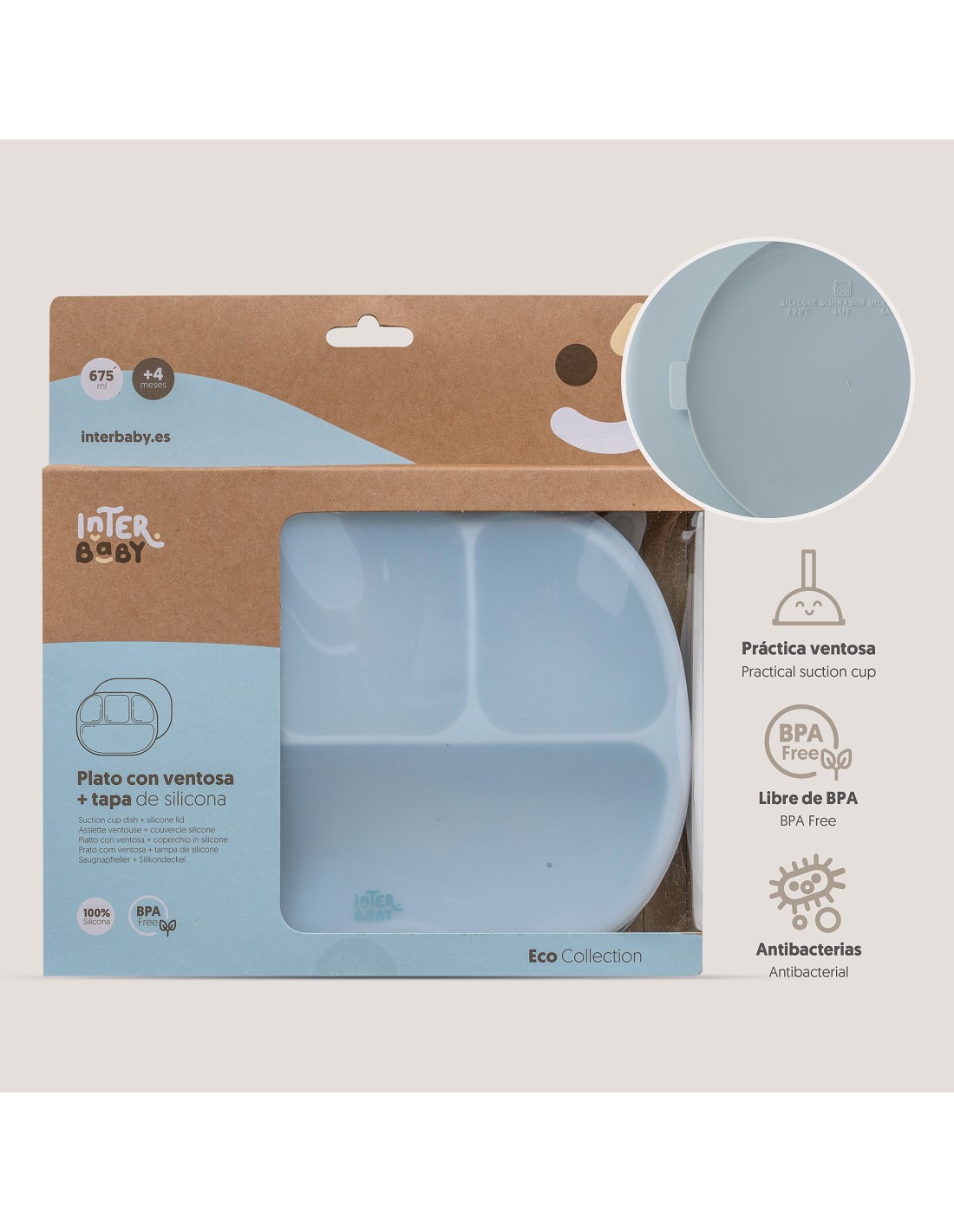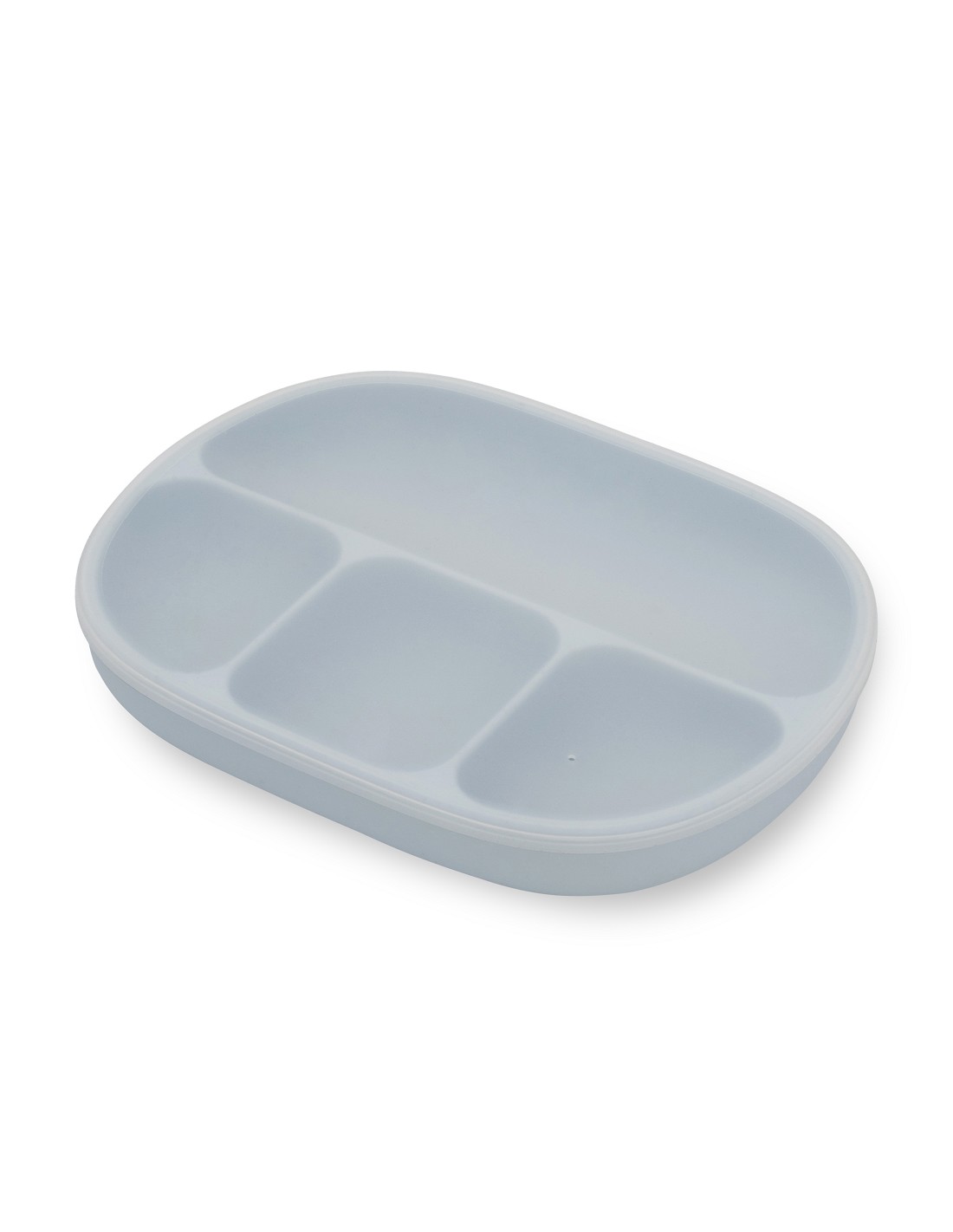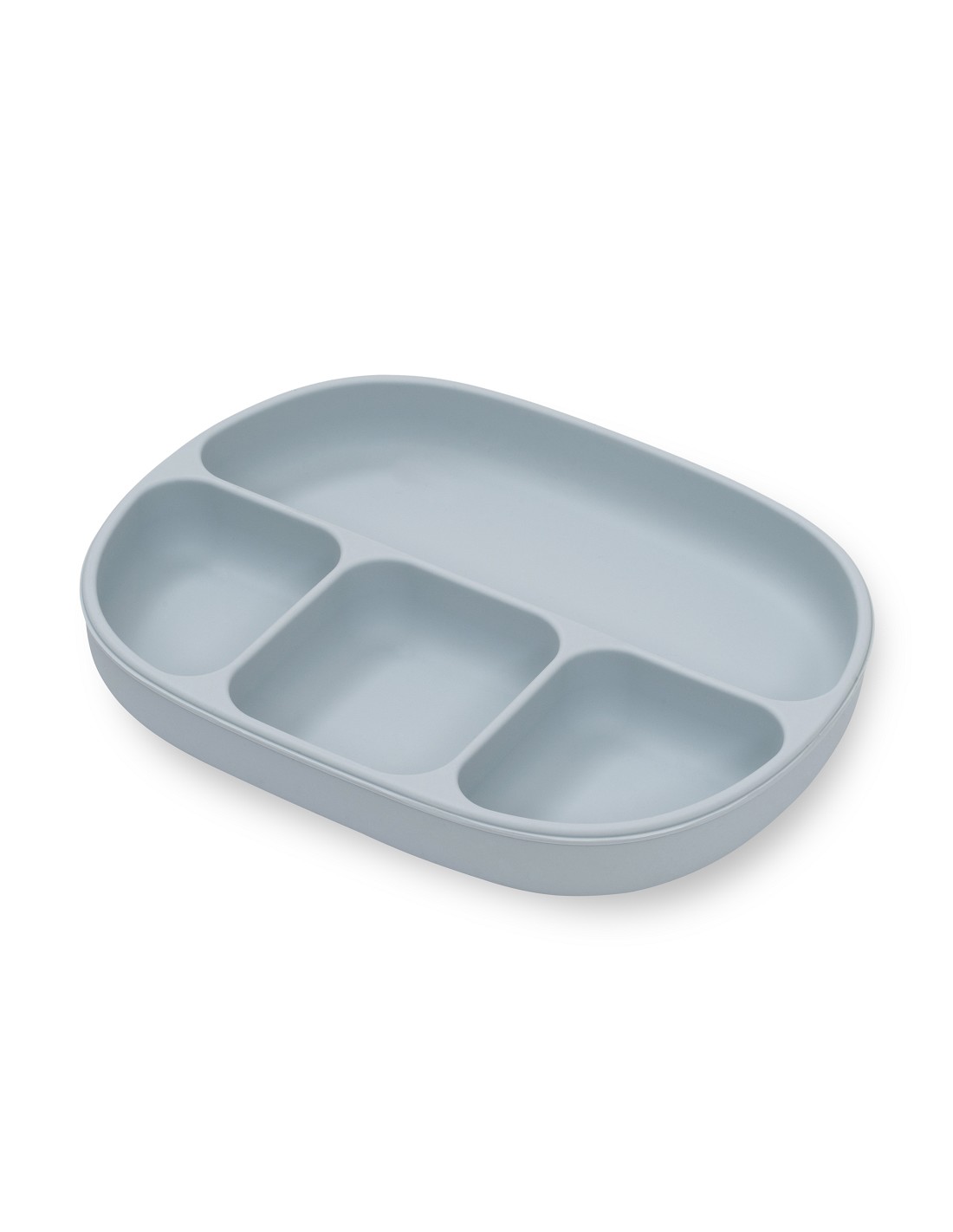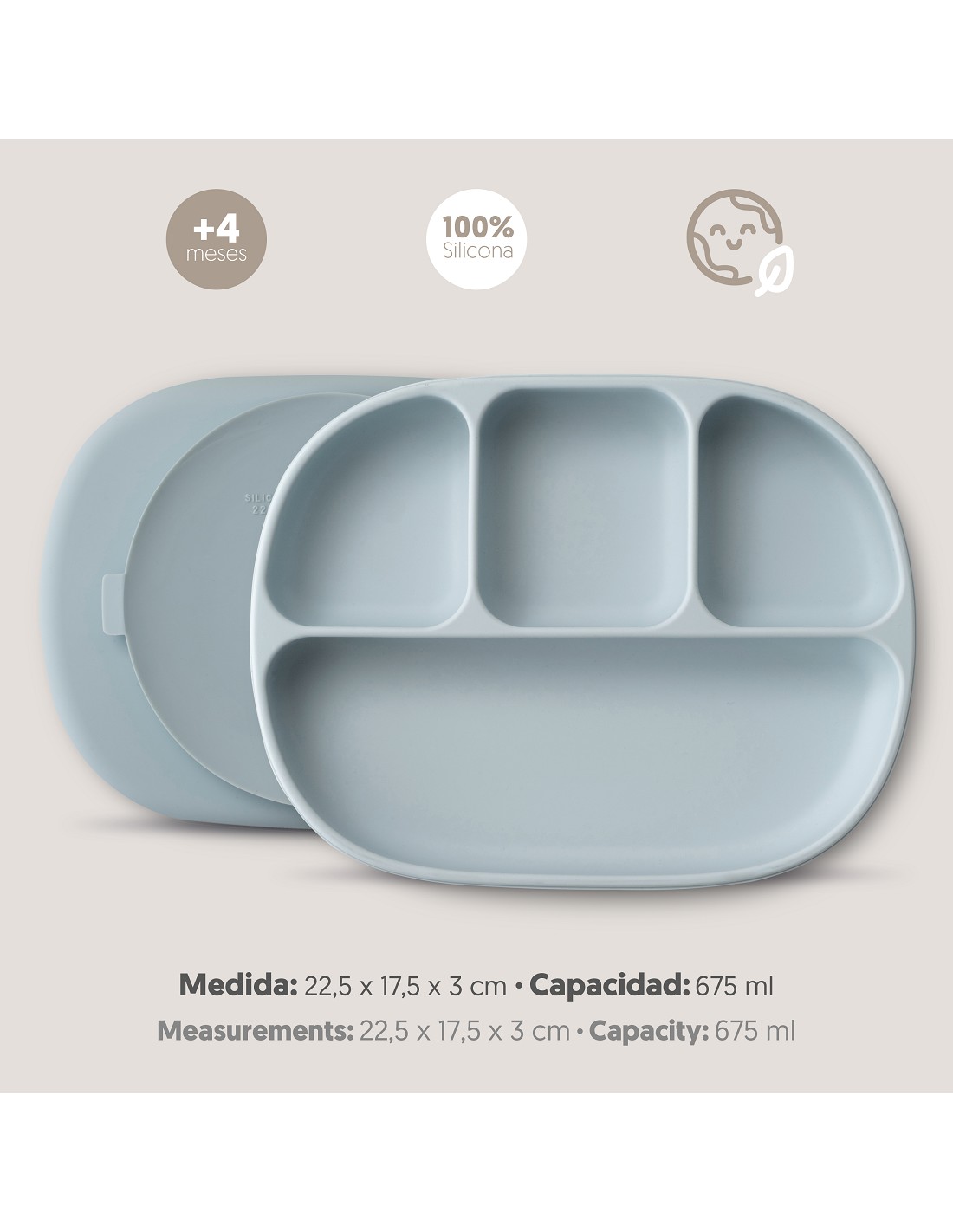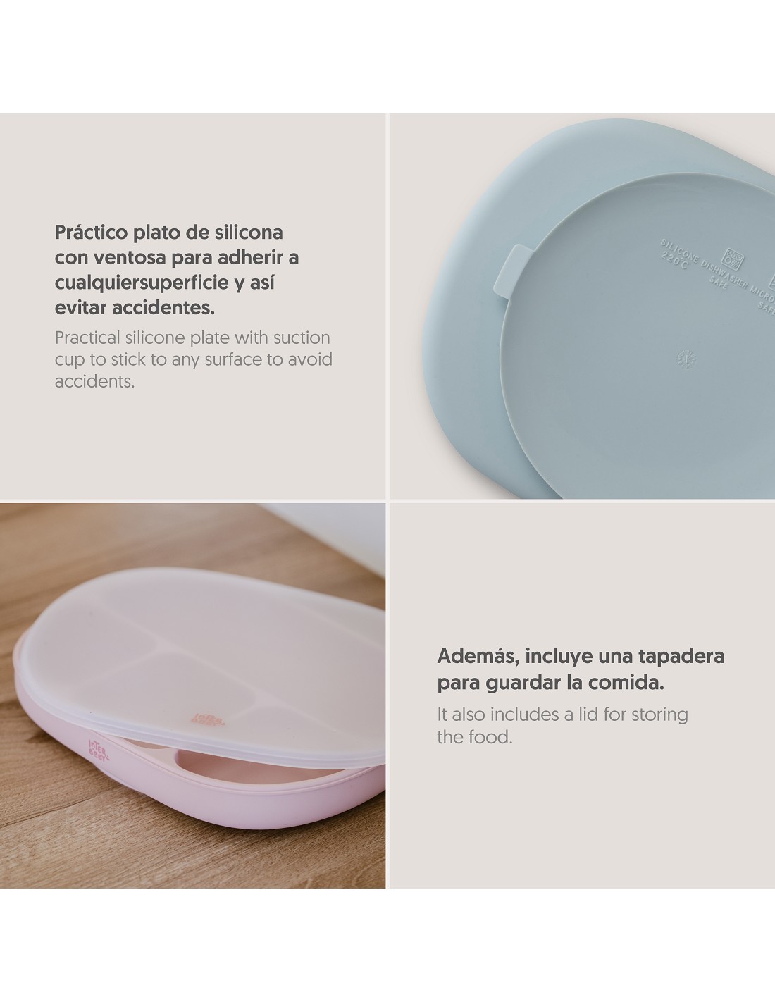 Plato de silicona que incorpora ventosas para eviatr accidentes. Dispone de 4 divisores para separar los distintos tipos de comida y que tu bebé experimente de manera individual el sabor y la textura de cada uno de ellos. Incluye tapadera para mejor conservación de la comida. Fácil limpieza y muy resistente. Libre de posibles infecciones al estar fabricado en silicona libre de BPA, PVC, Vinilo, Plomo y ftalatos. Apto para lavavajillas.