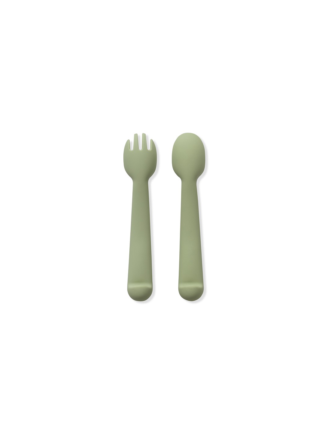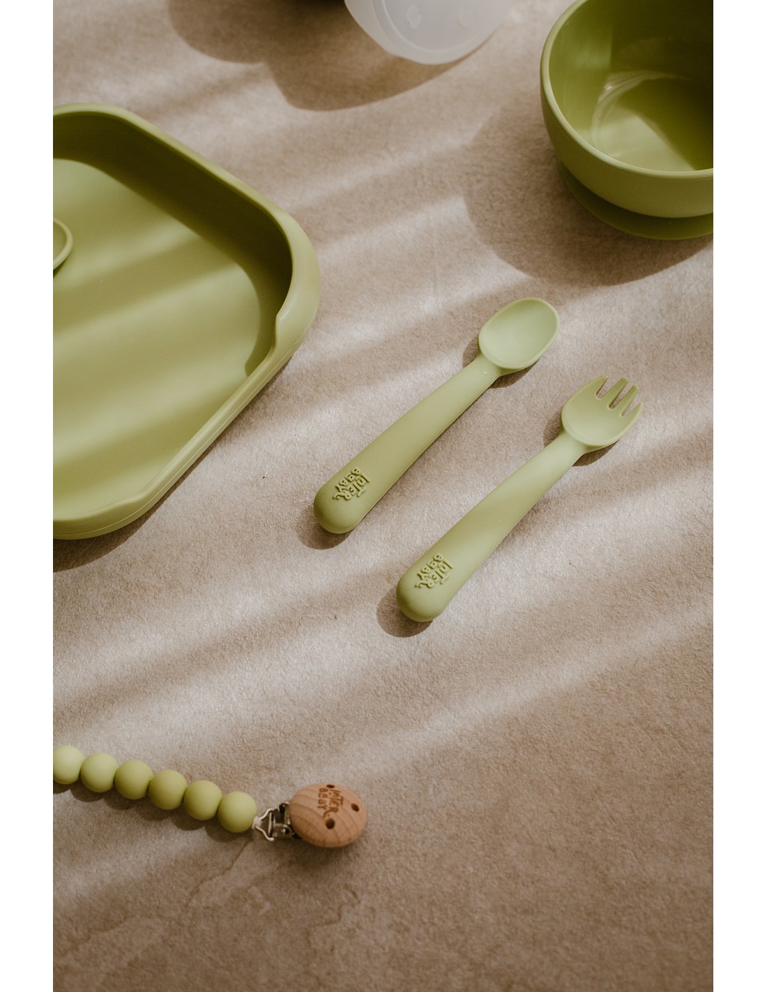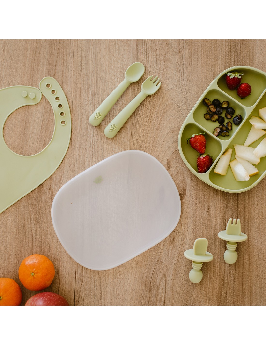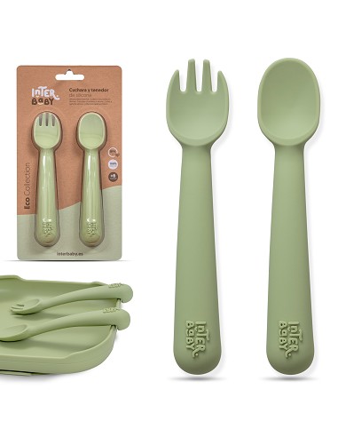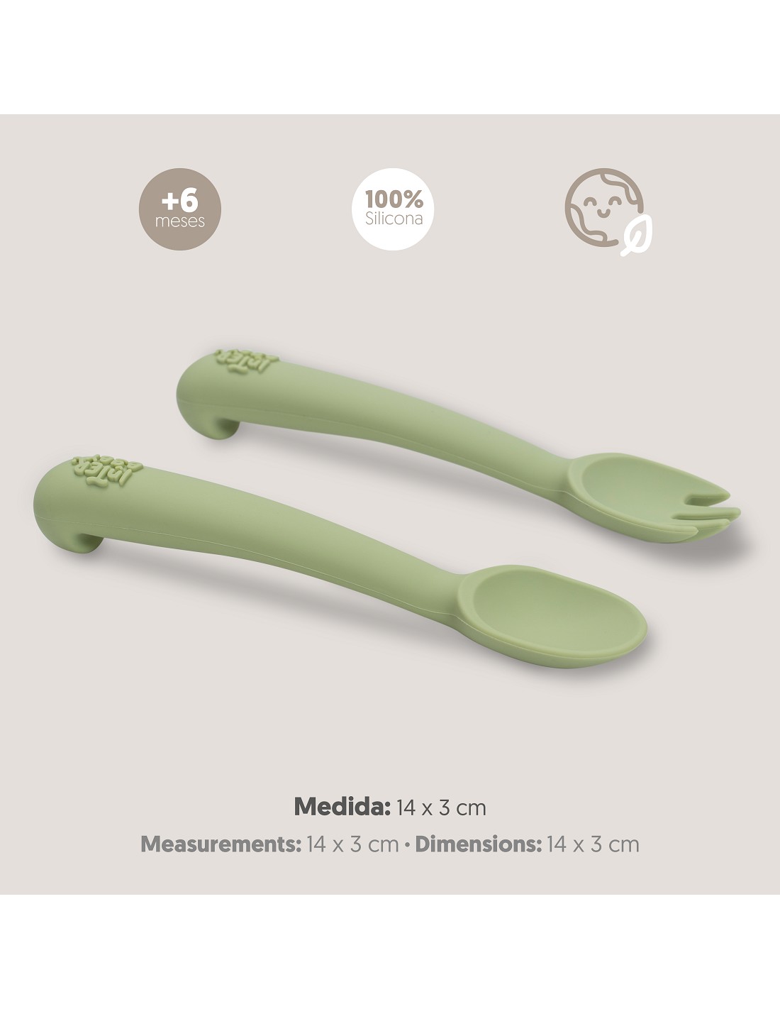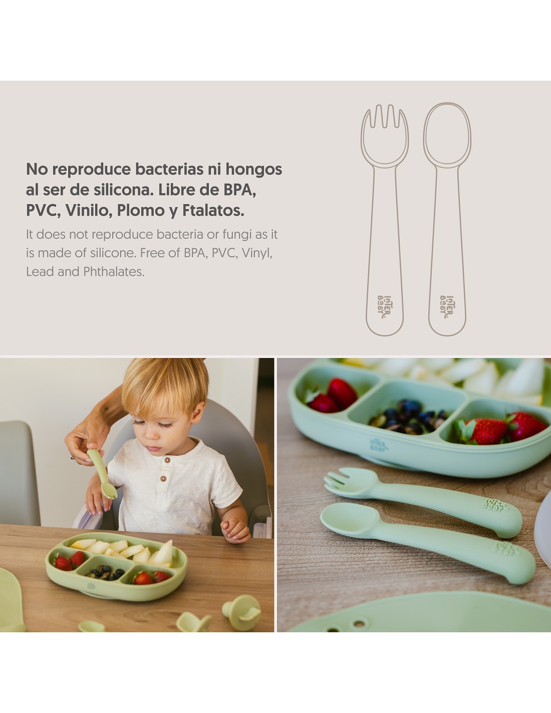 Cubiertos de silicona compuesto por cuchara y tenedor. Con ellos tu bebé dará sus primeros pasos en el aprendizaje de alimentarse por sí mismo. Libre de posibles infecciones al estar fabricado en silicona libre de BPA, PVC, Vinilo, Plomo y ftalatos. Apto para lavavajillas.